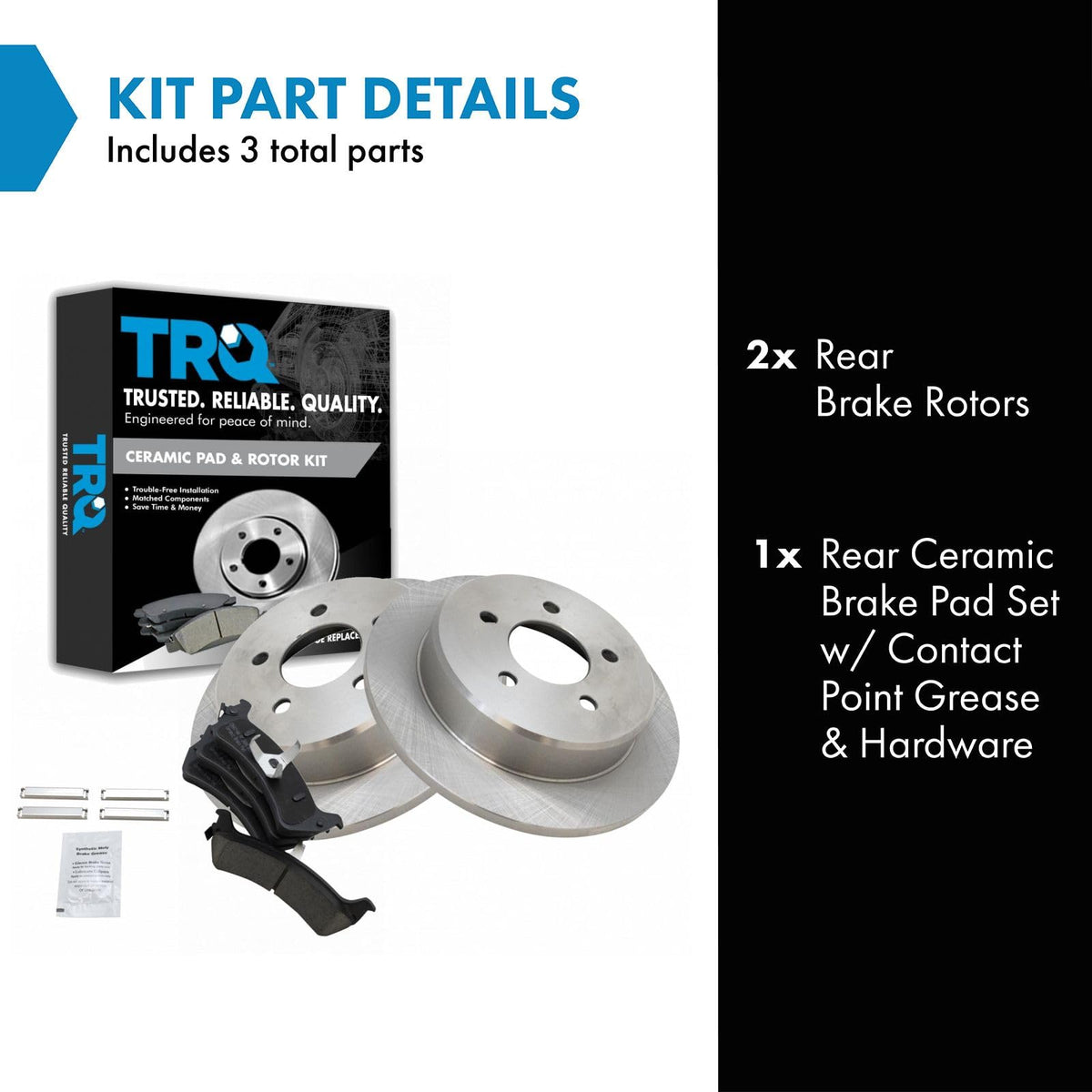 Ceramic Brake Pad & Rotor KitKit Includes(1) Rear Ceramic Brake Pad Set(2) Rear Brake RotorsFitmentCompatible with: 1998-02 Ford Ranger EV RearCompatible with: 1995-00 Ford Explorer RearCompatible with: 1997-01 Mercury Mountaineer RearCompatible with: 2001 Ford Explorer XLT RearCompatible with: 2001 Ford Explorer Eddie Bauer RearCompatible with: 2001 Ford Explorer XL Fleet RearCompatible with: 2001 Ford Explorer Limited RearCompatible with: 2001 Ford Explorer XLS RearCompatible with: 2002 Ford Explorer Sport with Phenolic Piston Calipers RearProduct AttributesRear Brake Rotor Diameter: 11.22 in. (285mm)Wheel Lug Count: 5 LugBrake Pad Friction Material: CeramicBrake Pad Bonding Type: Premium PosiRear Brake Rotor Venting Type: SolidProduct Features Positive Molded - Less dust resulting in clean wheels G3000 Casting Alloy - Reduced noise and improved wear resistance Application Specific Design - Extended service life, no modificationsItem DetailsTRQ brake kits are designed to restore your brake system to like-new performance. TRQ brake pads are positive molded, thermal scorched, chamfered, and utilize a multi-layer shim for enhanced performance and service life. TRQ rotors have a non-directional finish that reduces the break-in period for new rotors as well as reducing vibrations throughout the rotors lifecycle. All products are fit and road-tested in our Massachusetts R&D facility to ensure we deliver on our promise of Trusted Reliable Quality.Reference NumbersAimco: 54032Bendix: PRT5052DuraGo: BR54032Ford: 1L2Z2200CA, 2L2Z2200BA, F5TZ2200A, XL2Z2200AAHollander: 533-02294Mercury: F5TZ2200A, XL2Z2200AARaybestos Brakes: 66565, 66565FZN, 66565P, 66565R, EHT667HWagner: BD125463