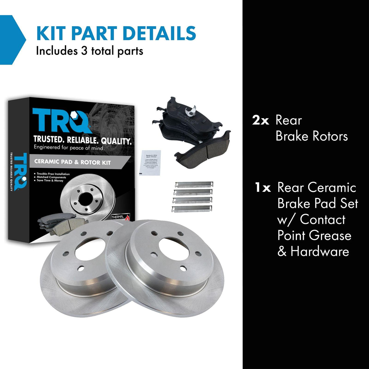 Ceramic Brake Pad & Rotor KitKit Includes(1) Rear Ceramic Brake Pad Set(2) Rear Brake RotorsFitmentCompatible with: 1996-02 Mercury Grand Marquis with Rear Phenolic Piston Calipers with 1 Inch Pad Clip RearCompatible with: 1996-02 Lincoln Town Car with Rear Phenolic Piston Calipers with 1 Inch Pad Clip RearCompatible with: 1996-02 Ford Crown Victoria with Rear Phenolic Piston Calipers with 1 Inch Pad Clip RearProduct AttributesRear Brake Rotor Diameter: 11.22 in. (285mm)Wheel Lug Count: 5 LugBrake Pad Friction Material: CeramicBrake Pad Bonding Type: Premium PosiRear Brake Rotor Venting Type: SolidProduct Features Positive Molded - Less dust resulting in clean wheels G3000 Casting Alloy - Reduced noise and improved wear resistance Application Specific Design - Extended service life, no modificationsItem DetailsTRQ brake kits are designed to restore your brake system to like-new performance. TRQ brake pads are positive molded, thermal scorched, chamfered, and utilize a multi-layer shim for enhanced performance and service life. TRQ rotors have a non-directional finish that reduces the break-in period for new rotors as well as reducing vibrations throughout the rotors lifecycle. All products are fit and road-tested in our Massachusetts R&D facility to ensure we deliver on our promise of Trusted Reliable Quality.Reference NumbersAimco: 54027Bendix: PRT5109DuraGo: BR54027Hollander: 533-02327Raybestos Brakes: 66595, 66595FZN, 66595P, 66595R, EHT674AHWagner: BD125481