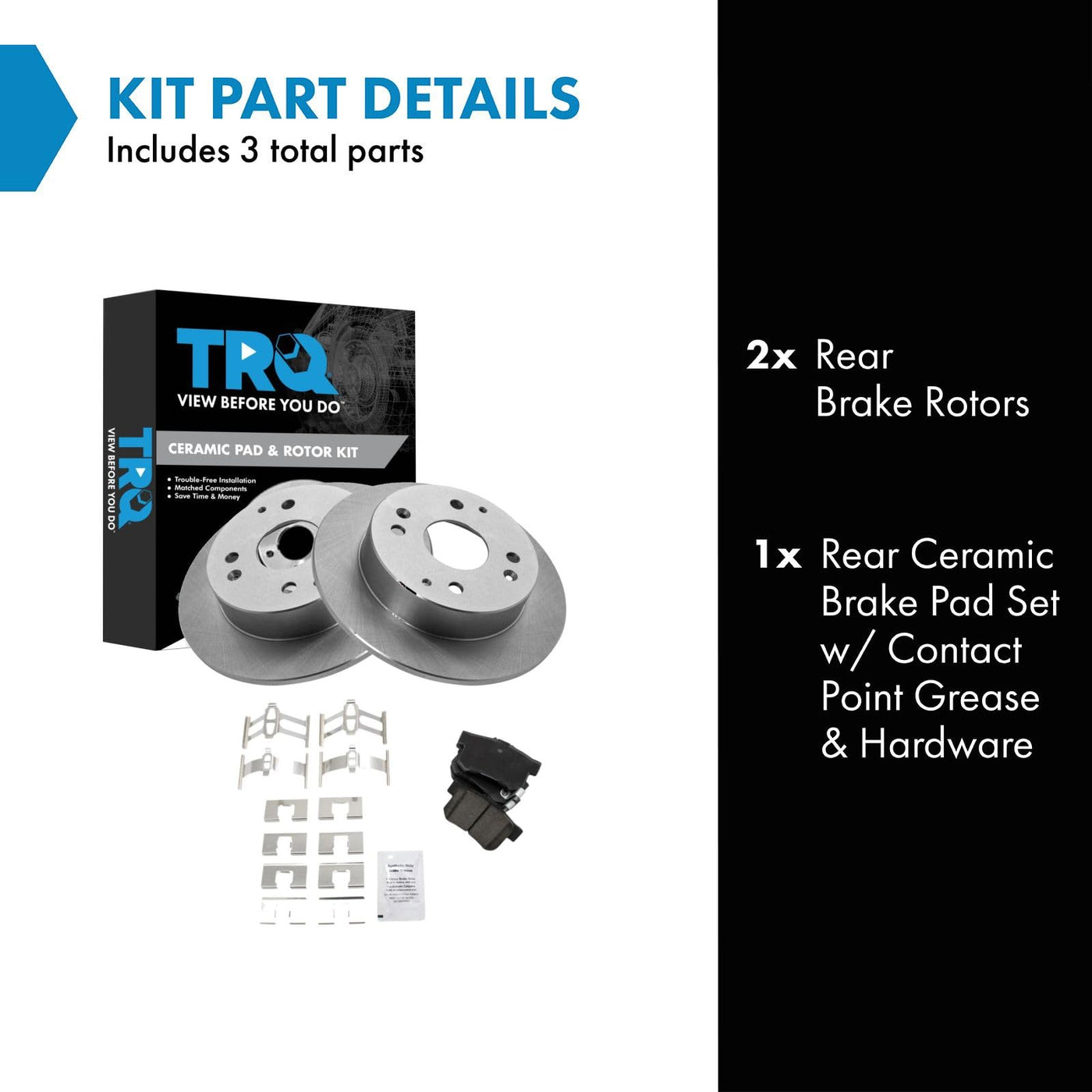 Ceramic Brake Pad & Rotor KitKit Includes(1) Rear Ceramic Brake Pad Set(2) Rear Brake RotorsFitmentCompatible with: 1998-02 Honda Accord L4 2.3L RearCompatible with: 1998-99 Acura CL RearProduct AttributesBrake Pad Friction Material: CeramicBrake Pad Bonding Type: Premium PosiProduct Features Positive Molded - Less dust resulting in clean wheels G3000 Casting Alloy - Reduced noise and improved wear resistance Application Specific Design - Extended service life, no modificationsItem DetailsTRQ brake kits are designed to restore your brake system to like-new performance. TRQ brake pads are positive molded, thermal scorched, chamfered, and utilize a multi-layer shim for enhanced performance and service life. TRQ rotors have a non-directional finish that reduces the break-in period for new rotors as well as reducing vibrations throughout the rotors lifecycle. All products are fit and road-tested in our Massachusetts R&D facility to ensure we deliver on our promise of Trusted Reliable Quality.Reference NumbersAcura: 43022S5AJ00, 43022S84A50, 43022SL5000, 43022SV4A20, 43022SV4G22, 43022SY8A00, 43022SY8A01, 43022TR0A00, 43022TR0A01Aimco: 31244Bendix: PRT5231DuraGo: BR31244Hollander: 533-58507Honda: 43022S2A000, 43022S5AJ00, 43022S6D010, 43022S6DE50, 43022S84A50, 43022SL5000, 43022SM4G00, 43022SV4A00, 43022SV4A20, 43022SV4A21, 43022SV4A22, 43022SV4A23, 43022SV4G20, 43022SV4G21, 43022SV4G22, 43022SY8A00, 43022SY8A01, 43022TR0A00, 43022TR0A01Raybestos Brakes: 96708, 96708FZN, 96708P, 96708R, EHT537H, MGD537CH, SGD537CSuzuki: 43022SM4G00, 55800-57L52, 5580057L00, 5580057L50, 5580080J00, 5580080J01, 5580080J02Wagner: BD125568