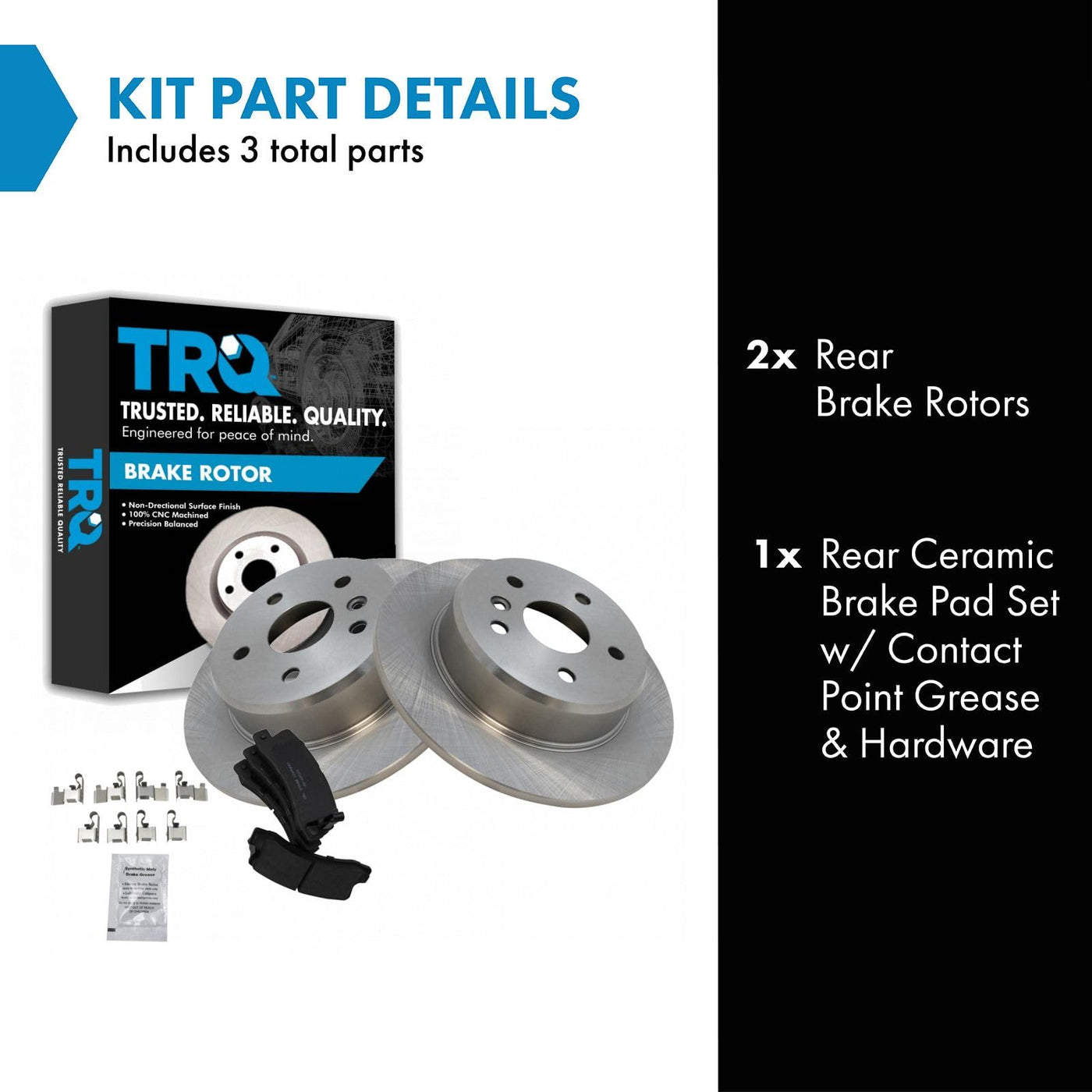 Ceramic Brake Pad & Rotor KitKit Includes(1) Rear Ceramic Brake Pad Set(2) Rear Brake RotorsFitmentCompatible with: 1999-03 Lexus RX300 All Wheel Drive RearProduct AttributesRear Brake Rotor Diameter: 11.34 in. (288mm)Wheel Lug Count: 5 LugBrake Pad Friction Material: CeramicBrake Pad Bonding Type: Premium PosiRear Brake Rotor Venting Type: SolidProduct Features Positive Molded - Less dust resulting in clean wheels G3000 Casting Alloy - Reduced noise and improved wear resistance Application Specific Design - Extended service life, no modificationsItem DetailsTRQ brake kits are designed to restore your brake system to like-new performance. TRQ brake pads are positive molded, thermal scorched, chamfered, and utilize a multi-layer shim for enhanced performance and service life. TRQ rotors have a non-directional finish that reduces the break-in period for new rotors as well as reducing vibrations throughout the rotors lifecycle. All products are fit and road-tested in our Massachusetts R&D facility to ensure we deliver on our promise of Trusted Reliable Quality.Reference NumbersAimco: 31261Bendix: PRT5221DuraGo: BR31261Hollander: 533-58513Lexus: 446632010, 446633040, 446633050, 446633110, 449232010, 449232070, 449233010Raybestos Brakes: 96819, 96819FZN, 96819P, 96819R, EHT325H, MGD325CH, SGD325CToyota: 446620080, 446632010, 446632050, 446633010, 446633040, 449220011, 449220050, 449220051, 449220060, 449220061, 449232040, 449232041, 449233010Wagner: BD125682, BD180046