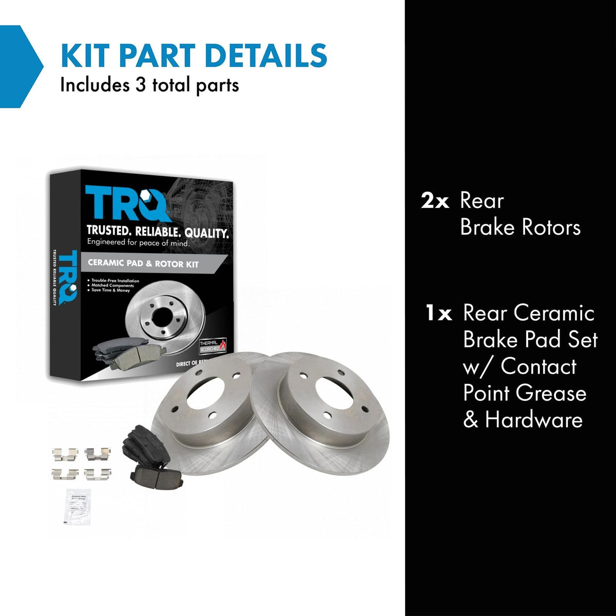 Ceramic Brake Pad & Rotor KitKit Includes(1) Rear Ceramic Brake Pad Set(2) Rear Brake RotorsFitmentCompatible with: 2004-06 Nissan Sentra SE-R RearCompatible with: 2002-03 Nissan Sentra SE-R RearCompatible with: 2002 Infiniti G20 RearCompatible with: 2001 Infiniti G20 From 12/01/00 Production Date RearProduct AttributesRear Brake Rotor Diameter: 10.16 in. (258mm)Wheel Lug Count: 4 LugBrake Pad Friction Material: CeramicBrake Pad Bonding Type: Premium PosiRear Brake Rotor Venting Type: SolidProduct Features Positive Molded - Less dust resulting in clean wheels G3000 Casting Alloy - Reduced noise and improved wear resistance Application Specific Design - Extended service life, no modificationsItem DetailsTRQ brake kits are designed to restore your brake system to like-new performance. TRQ brake pads are positive molded, thermal scorched, chamfered, and utilize a multi-layer shim for enhanced performance and service life. TRQ rotors have a non-directional finish that reduces the break-in period for new rotors as well as reducing vibrations throughout the rotors lifecycle. All products are fit and road-tested in our Massachusetts R&D facility to ensure we deliver on our promise of Trusted Reliable Quality.Reference NumbersAimco: 31058DuraGo: BR31046Hollander: 533-58230, 533-58516INFINITI: 440604U092, 440606Y390, 440606Y391, 44060AU091Nissan: 440604U092, 440606Y390, 440606Y391, 440606Z325, 44060AU091Raybestos Brakes: 96133, 96133R, 96408, 96408FZN, 96408P, 96408R, EHT900H, MGD900CH