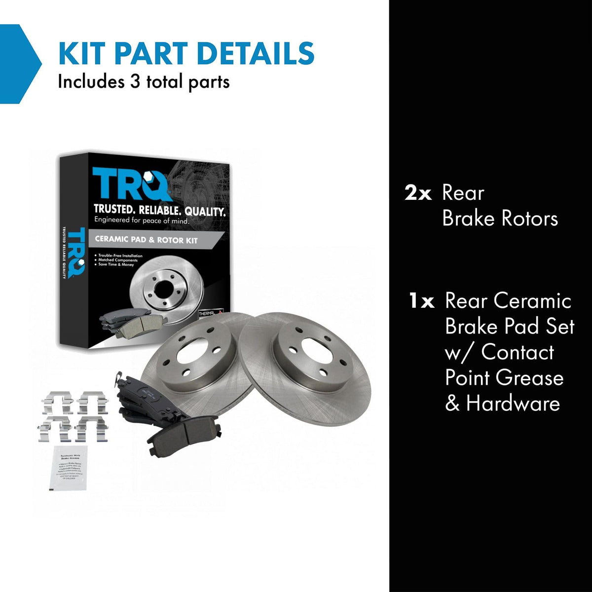 Ceramic Brake Pad & Rotor KitKit Includes(1) Rear Ceramic Brake Pad Set(2) Rear Brake RotorsFitmentCompatible with: 2000-05 Cadillac Deville with 5 Lug Wheels RearCompatible with: 2003-05 Buick Park Avenue Ultra RearCompatible with: 2004-05 Pontiac Bonneville GXP RearCompatible with: 2003-04 Cadillac Seville RearProduct AttributesBrake Pad Friction Material: CeramicBrake Pad Bonding Type: Premium PosiProduct Features Positive Molded - Less dust resulting in clean wheels G3000 Casting Alloy - Reduced noise and improved wear resistance Application Specific Design - Extended service life, no modificationsItem DetailsTRQ brake kits are designed to restore your brake system to like-new performance. TRQ brake pads are positive molded, thermal scorched, chamfered, and utilize a multi-layer shim for enhanced performance and service life. TRQ rotors have a non-directional finish that reduces the break-in period for new rotors as well as reducing vibrations throughout the rotors lifecycle. All products are fit and road-tested in our Massachusetts R&D facility to ensure we deliver on our promise of Trusted Reliable Quality.Reference NumbersAimco: 55051Bendix: PRT5220Buick: 18043995, 18043999Cadillac: 18029826, 18043995, 18043999Chevrolet: 18024530, 18043995DuraGo: BR55051Hollander: 533-02375Oldsmobile: 12510045, 18029826, 18043995, 18043999Pontiac: 18043995, 18043999Raybestos Brakes: 56698, 56698FZN, 56698P, 56698R, EHT714H, MGD714CH, SGD714CSaturn: 21012052Wagner: BD125562