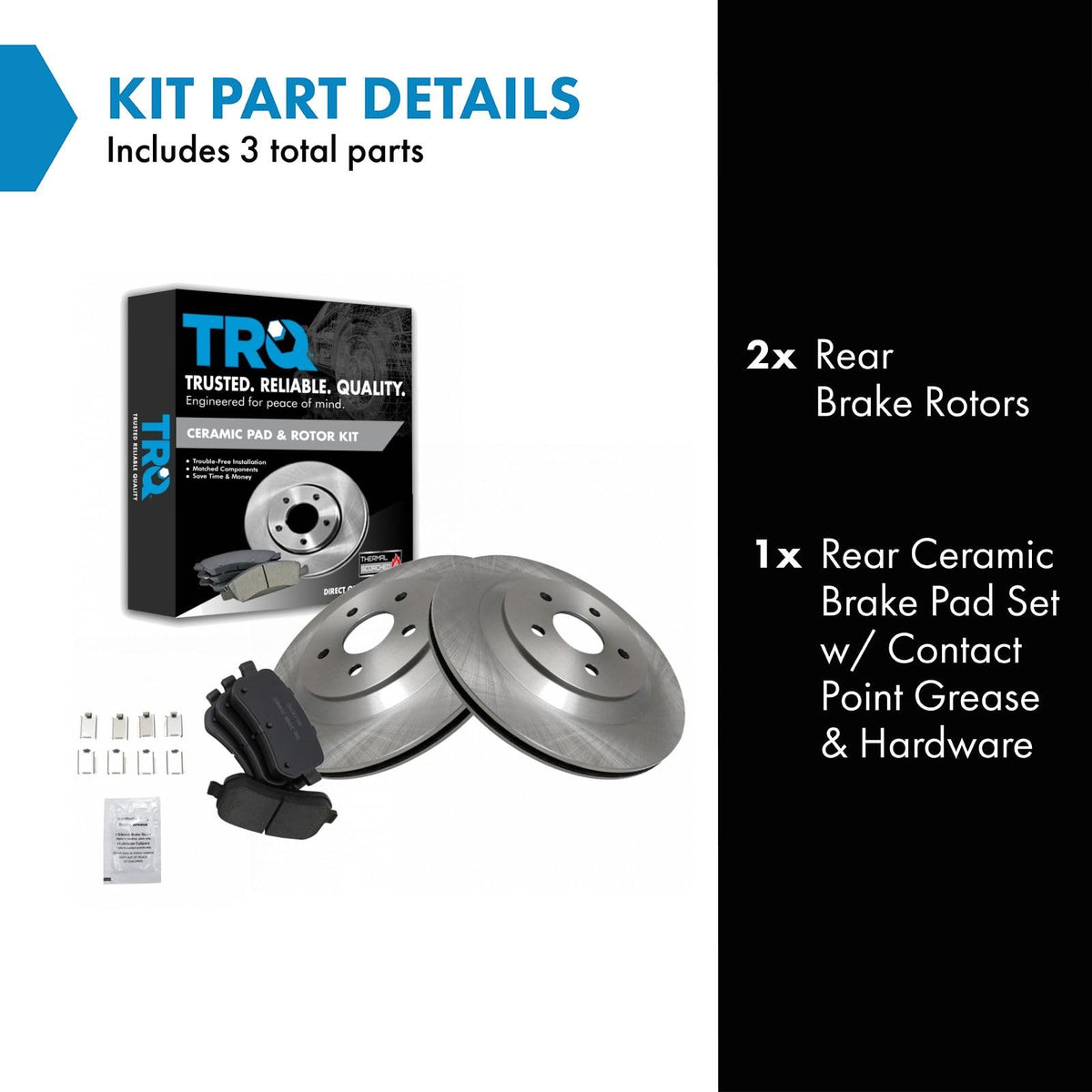 Ceramic Brake Pad & Rotor KitKit Includes(1) Rear Ceramic Brake Pad Set(2) Rear Brake RotorsFitmentCompatible with: 2004-07 Ford Freestar RearCompatible with: 2004-07 Mercury Monterey RearProduct AttributesRear Brake Rotor Diameter: 12.44 in. (316mm)Wheel Lug Count: 5 LugBrake Pad Friction Material: CeramicBrake Pad Bonding Type: Premium PosiRear Brake Rotor Venting Type: VentedProduct Features Positive Molded - Less dust resulting in clean wheels G3000 Casting Alloy - Reduced noise and improved wear resistance Application Specific Design - Extended service life, no modificationsItem DetailsTRQ brake kits are designed to restore your brake system to like-new performance. TRQ brake pads are positive molded, thermal scorched, chamfered, and utilize a multi-layer shim for enhanced performance and service life. TRQ rotors have a non-directional finish that reduces the break-in period for new rotors as well as reducing vibrations throughout the rotors lifecycle. All products are fit and road-tested in our Massachusetts R&D facility to ensure we deliver on our promise of Trusted Reliable Quality.Reference NumbersAimco: 54117Bendix: PRT5478DuraGo: BR54117Ford: 3F2Z2200AA, 5F2Z2200AAMercury: 3F2Z2200AA, 5F2Z2200AARaybestos Brakes: 680189, 680189FZN, 680189P, 680189R, EHT1021H, MGD1021CH, SGD1021CWagner: BD126125