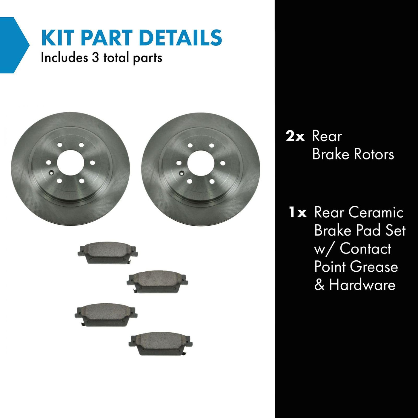 Ceramic Brake Pad & Rotor KitKit Includes(1) Rear Ceramic Brake Pad Set(2) Rear Brake RotorsFitmentCompatible with: 2004-09 Cadillac SRX with 17 Inch Wheels RearProduct AttributesRear Brake Rotor Diameter: 12.56 in. (319mm)Wheel Lug Count: 6 LugBrake Pad Friction Material: CeramicRear Brake Rotor Venting Type: VentedProduct Features Positive Molded - Less dust resulting in clean wheels G3000 Casting Alloy - Reduced noise and improved wear resistance Application Specific Design - Extended service life, no modificationsItem DetailsTRQ brake kits are designed to restore your brake system to like-new performance. TRQ brake pads are positive molded, thermal scorched, chamfered, and utilize a multi-layer shim for enhanced performance and service life. TRQ rotors have a non-directional finish that reduces the break-in period for new rotors as well as reducing vibrations throughout the rotors lifecycle. All products are fit and road-tested in our Massachusetts R&D facility to ensure we deliver on our promise of Trusted Reliable Quality.Reference NumbersAimco: 55114Bendix: PRT5772Cadillac: 89047757, 89047758DuraGo: BR900374Hollander: 533-02459Raybestos Brakes: 580260, 580260FZN, 580260P, 580260R, EHT1020H, MGD1020CH, SGD1020CWagner: BD126285