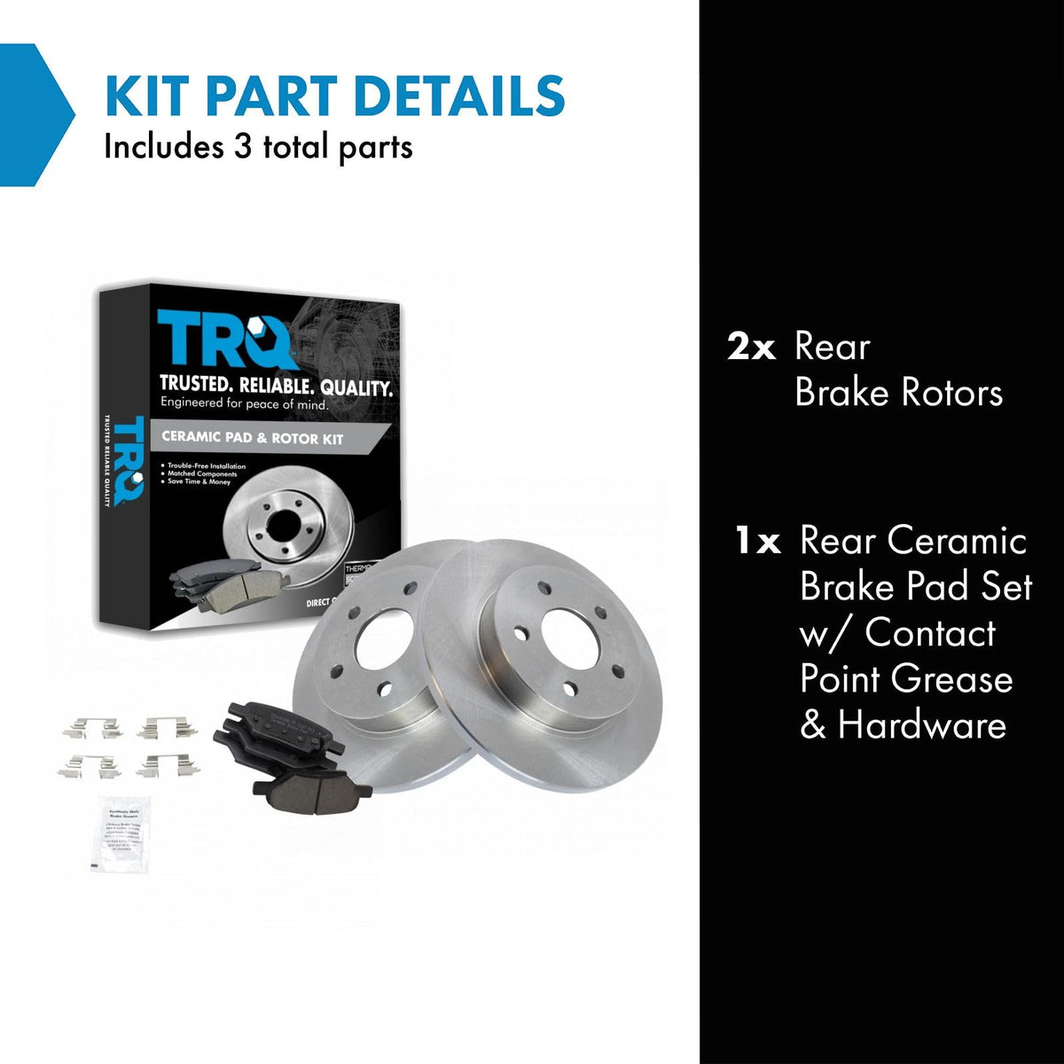 Ceramic Brake Pad & Rotor KitKit Includes(1) Rear Ceramic Brake Pad Set with Contact Point Grease & Hardware(2) Rear Brake RotorsFitmentCompatible with: 2004-12 Chevrolet Malibu RearCompatible with: 2005-10 Pontiac G6 RearCompatible with: 2005-07 Chevrolet Cobalt SS RearCompatible with: 2008-10 Chevrolet HHR RearCompatible with: 2004-07 Saturn Ion Red Line RearCompatible with: 2007-09 Saturn Aura RearCompatible with: 2007-09 Pontiac G5 RearProduct AttributesRear Brake Rotor Diameter: 10.63 in. (270mm)Wheel Lug Count: 5 LugBrake Pad Friction Material: CeramicBrake Pad Bonding Type: Premium PosiRear Brake Rotor Venting Type: SolidProduct Features Positive Molded - Less dust resulting in clean wheels G3000 Casting Alloy - Reduced noise and improved wear resistance Application Specific Design - Extended service life, no modificationsItem DetailsTRQ brake kits are designed to restore your brake system to like-new performance. TRQ brake pads are positive molded, thermal scorched, chamfered, and utilize a multi-layer shim for enhanced performance and service life. TRQ rotors have a non-directional finish that reduces the break-in period for new rotors as well as reducing vibrations throughout the rotors lifecycle. All products are fit and road-tested in our Massachusetts R&D facility to ensure we deliver on our promise of Trusted Reliable Quality.Reference NumbersAimco: 55094Bendix: PRT5563Chevrolet: 10365723, 15243254DuraGo: BR55094Pontiac: 10365723, 15243254Raybestos Brakes: 580243, 580243FZN, 580243P, 580243R, EHT1033H, MGD1033CH, SGD1033CSaturn: 10365723, 15243254Wagner: BD126136, BD126566