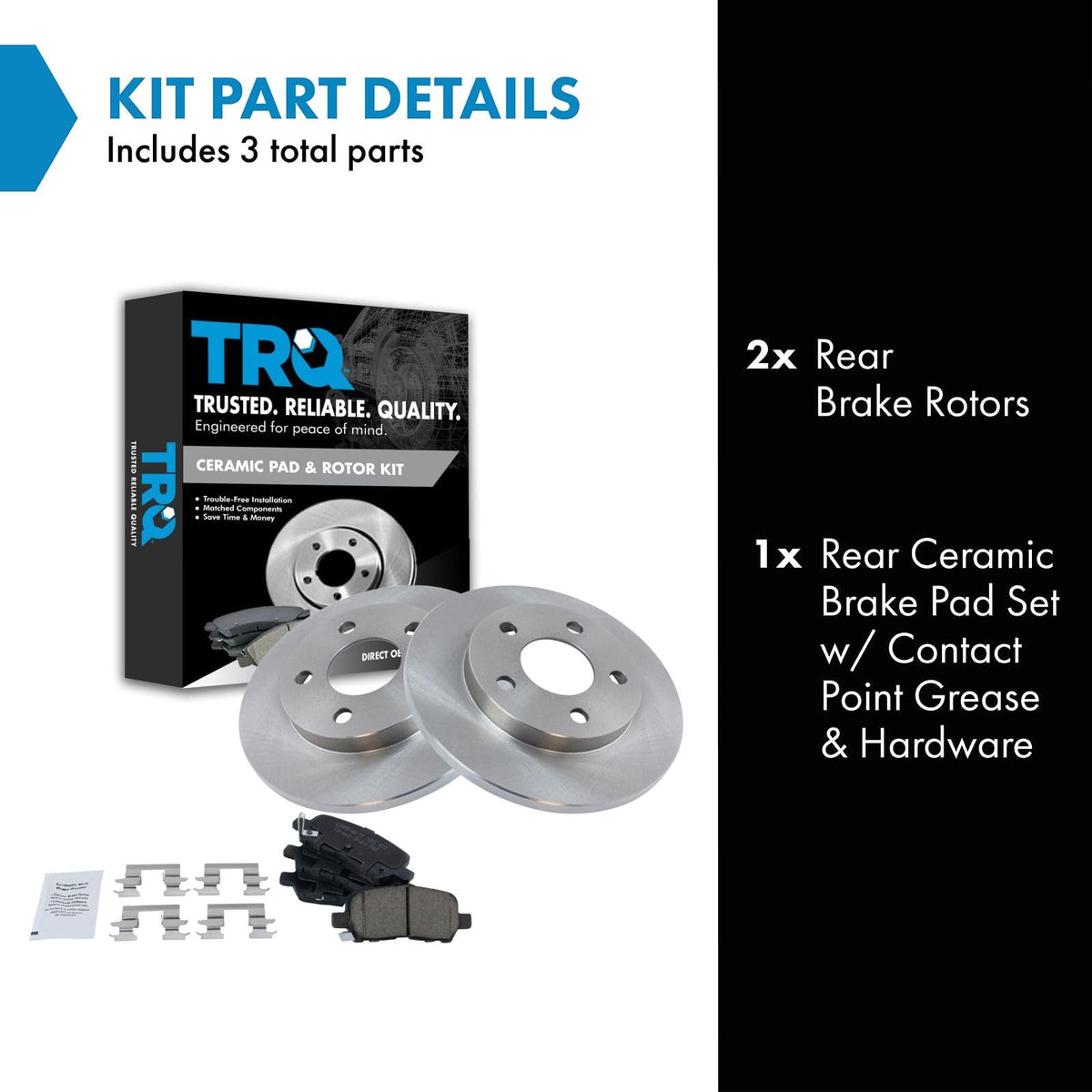 Ceramic Brake Pad & Rotor KitKit Includes(1) Rear Ceramic Brake Pad Set(2) Rear Brake RotorsFitmentCompatible with: 2011-13 Chevrolet Impala RearCompatible with: 2005-09 Buick LaCrosse CXL RearCompatible with: 2005-09 Buick LaCrosse CX RearCompatible with: 2005-08 Pontiac Grand Prix Base Model RearCompatible with: 2005-09 Buick LaCrosse CXS RearCompatible with: 2005-07 Pontiac Grand Prix GT RearCompatible with: 2014-16 Chevrolet Impala Limited RearCompatible with: 2004 Pontiac Grand Prix RearCompatible with: 2005 Pontiac Grand Prix GTP RearCompatible with: 2005-08 Buick Allure RearProduct AttributesRear Brake Rotor Diameter: 10.63 in. (270mm)Wheel Lug Count: 5 LugBrake Pad Friction Material: CeramicBrake Pad Bonding Type: Premium PosiRear Brake Rotor Venting Type: SolidProduct Features Positive Molded - Less dust resulting in clean wheels G3000 Casting Alloy - Reduced noise and improved wear resistance Application Specific Design - Extended service life, no modificationsItem DetailsTRQ brake kits are designed to restore your brake system to like-new performance. TRQ brake pads are positive molded, thermal scorched, chamfered, and utilize a multi-layer shim for enhanced performance and service life. TRQ rotors have a non-directional finish that reduces the break-in period for new rotors as well as reducing vibrations throughout the rotors lifecycle. All products are fit and road-tested in our Massachusetts R&D facility to ensure we deliver on our promise of Trusted Reliable Quality.Reference NumbersAimco: 55085Bendix: PRT5442Buick: 18048690Chevrolet: 18048690DuraGo: BR55085Pontiac: 18048690Raybestos Brakes: 580171, 580171FZN, 580171P, 580171R, 581033, 581033FZN, 581033P, 581033R, EHT999H, MGD999CH, SGD999CWagner: BD126180
