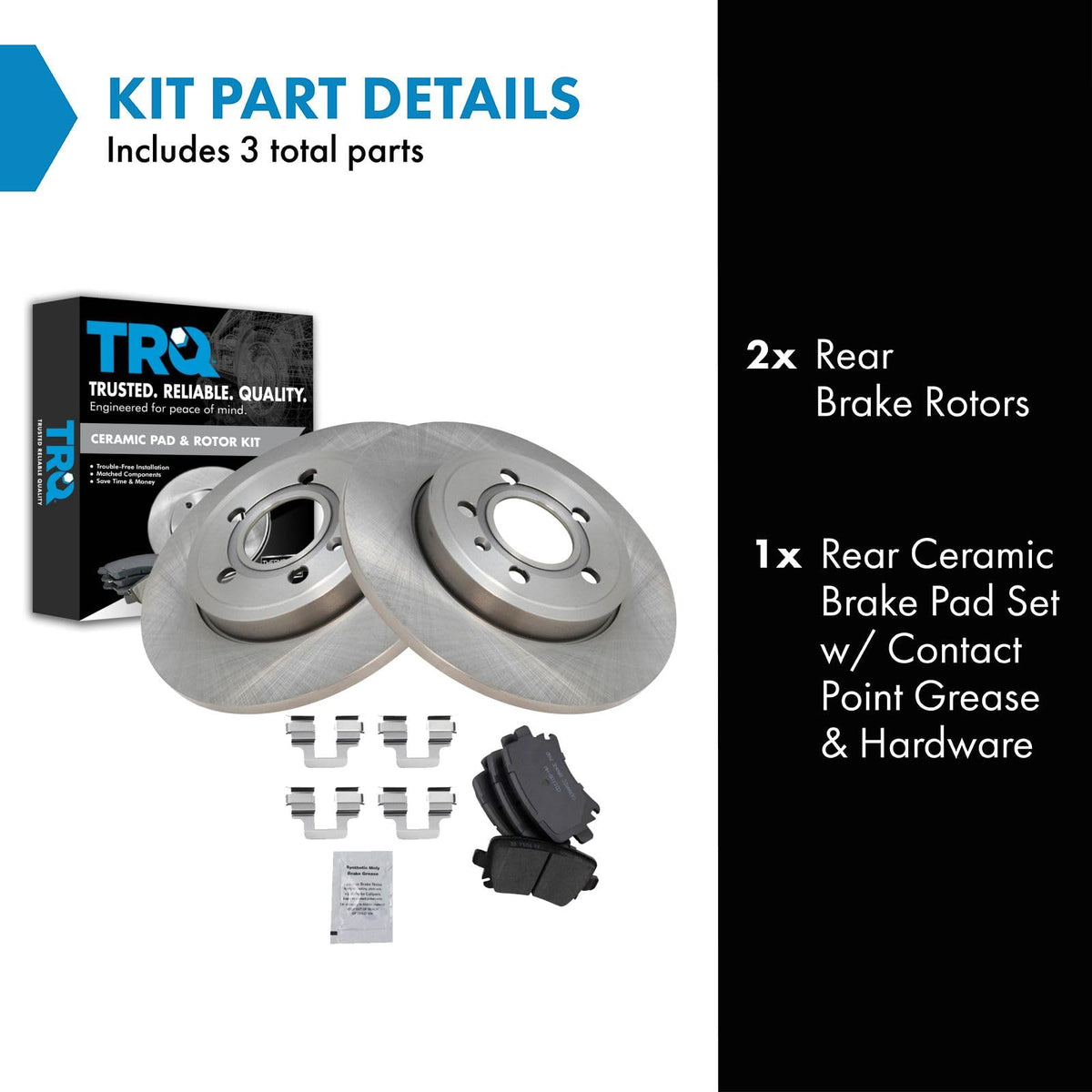 Ceramic Brake Pad & Rotor KitKit Includes(1) Rear Ceramic Brake Pad Set(2) Rear Brake RotorsFitmentCompatible with: 2007-08 Audi A4 Quattro with 11.33 in. 288mm Diameter Rear Rotors RearCompatible with: 2009 Audi A4 Quattro Convertible with 11.33 in. 288mm Diameter Rear Rotors RearCompatible with: 2007-08 Audi A4 with 11.33 in. 288mm Diameter Rear Rotors RearCompatible with: 2006 Audi A4 Quattro V6 3.2L with 11.33 in. 288mm Diameter Rear Rotors RearCompatible with: 2006 Audi A4 V6 3.2L with 11.33 in. 288mm Diameter Rear Rotors RearCompatible with: 2009 Audi A4 Convertible with 11.33 in. 288mm Diameter Rear Rotors RearProduct AttributesRear Brake Rotor Diameter: 11.34 in. (288mm)Wheel Lug Count: 5 LugBrake Pad Friction Material: CeramicRear Brake Rotor Venting Type: SolidProduct Features Positive Molded - Less dust resulting in clean wheels G3000 Casting Alloy - Reduced noise and improved wear resistance Application Specific Design - Extended service life, no modificationsItem DetailsTRQ brake kits are designed to restore your brake system to like-new performance. TRQ brake pads are positive molded, thermal scorched, chamfered, and utilize a multi-layer shim for enhanced performance and service life. TRQ rotors have a non-directional finish that reduces the break-in period for new rotors as well as reducing vibrations throughout the rotors lifecycle. All products are fit and road-tested in our Massachusetts R&D facility to ensure we deliver on our promise of Trusted Reliable Quality.Reference NumbersAimco: 34306Audi: 1K0698451B, 1K0698451D, 1K0698451G, 1K0698451K, 4F0698451A, 4F0698451D, 8E0698451F, 8E0698451J, 8E0698451MBendix: PRT6038DuraGo: BR900434Raybestos Brakes: 980468, 980468FZN, 980468P, 980468R, EHT1108H, MGD1108CHSeat: 1K0698451KVolkswagen: 1K0698451E, 1K0698451F, 1K0698451G, 1K0698451H, 1K0698451K, 3C0698451, 3C0698451A, 3C0698451B, 5N0698451Wagner: BD180093
