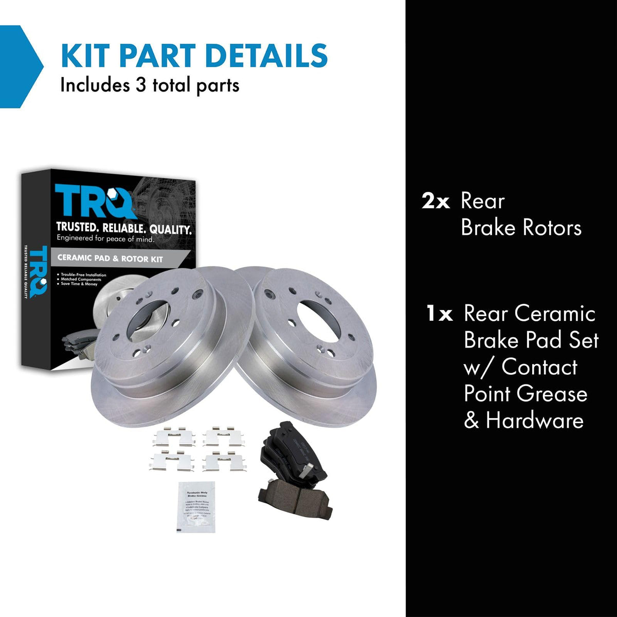 Ceramic Brake Pad & Rotor KitKit Includes(1) Rear Ceramic Brake Pad Set(2) Rear Brake RotorsFitmentCompatible with: 2006-09 Hyundai Azera RearProduct AttributesRear Brake Rotor Diameter: 11.18 in. (284mm)Wheel Lug Count: 5 LugBrake Pad Friction Material: CeramicBrake Pad Bonding Type: Premium PosiRear Brake Rotor Venting Type: SolidProduct Features Positive Molded - Less dust resulting in clean wheels G3000 Casting Alloy - Reduced noise and improved wear resistance Application Specific Design - Extended service life, no modificationsItem DetailsTRQ brake kits are designed to restore your brake system to like-new performance. TRQ brake pads are positive molded, thermal scorched, chamfered, and utilize a multi-layer shim for enhanced performance and service life. TRQ rotors have a non-directional finish that reduces the break-in period for new rotors as well as reducing vibrations throughout the rotors lifecycle. All products are fit and road-tested in our Massachusetts R&D facility to ensure we deliver on our promise of Trusted Reliable Quality.Reference NumbersAimco: 31421Bendix: PRT5852DuraGo: BR900398Hollander: 533-50110Hyundai: 5830226A20, 583022EA00, 583022HA00, 5830238A10, 583023KA10, 583023KA50, 583023KA51, 583023KA60Kia: 583022EA00, 5830238A10, 583023FA00Raybestos Brakes: 980417, 980417FZN, 980417P, 980417R, EHT813H, MGD813CH, SGD813CWagner: BD126460