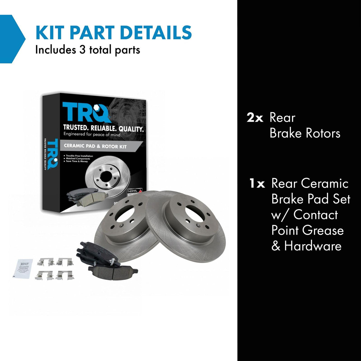 Ceramic Brake Pad & Rotor KitKit Includes(1) Rear Ceramic Brake Pad Set(2) Rear Brake RotorsFitmentCompatible with: 2006-11 Buick Lucerne RearCompatible with: 2006-11 Cadillac DTS with RPO Code JL9 Power 4 Wheel ABS Disc Brakes RearProduct AttributesRear Brake Rotor Diameter: 11.46 in. (291mm)Wheel Lug Count: 5 LugBrake Pad Friction Material: CeramicBrake Pad Bonding Type: Premium PosiRear Brake Rotor Venting Type: SolidProduct Features Positive Molded - Less dust resulting in clean wheels G3000 Casting Alloy - Reduced noise and improved wear resistance Application Specific Design - Extended service life, no modificationsItem DetailsTRQ brake kits are designed to restore your brake system to like-new performance. TRQ brake pads are positive molded, thermal scorched, chamfered, and utilize a multi-layer shim for enhanced performance and service life. TRQ rotors have a non-directional finish that reduces the break-in period for new rotors as well as reducing vibrations throughout the rotors lifecycle. All products are fit and road-tested in our Massachusetts R&D facility to ensure we deliver on our promise of Trusted Reliable Quality.Reference NumbersAimco: 55127Autopart International: 1407-80374Bendix: PRT5740Buick: 15773987Cadillac: 15773987DuraGo: BR900276Raybestos Brakes: 580405, 580405FZN, 580405P, 580405R, EHT1172H, MGD1172CH, SGD1172CWagner: BD180180