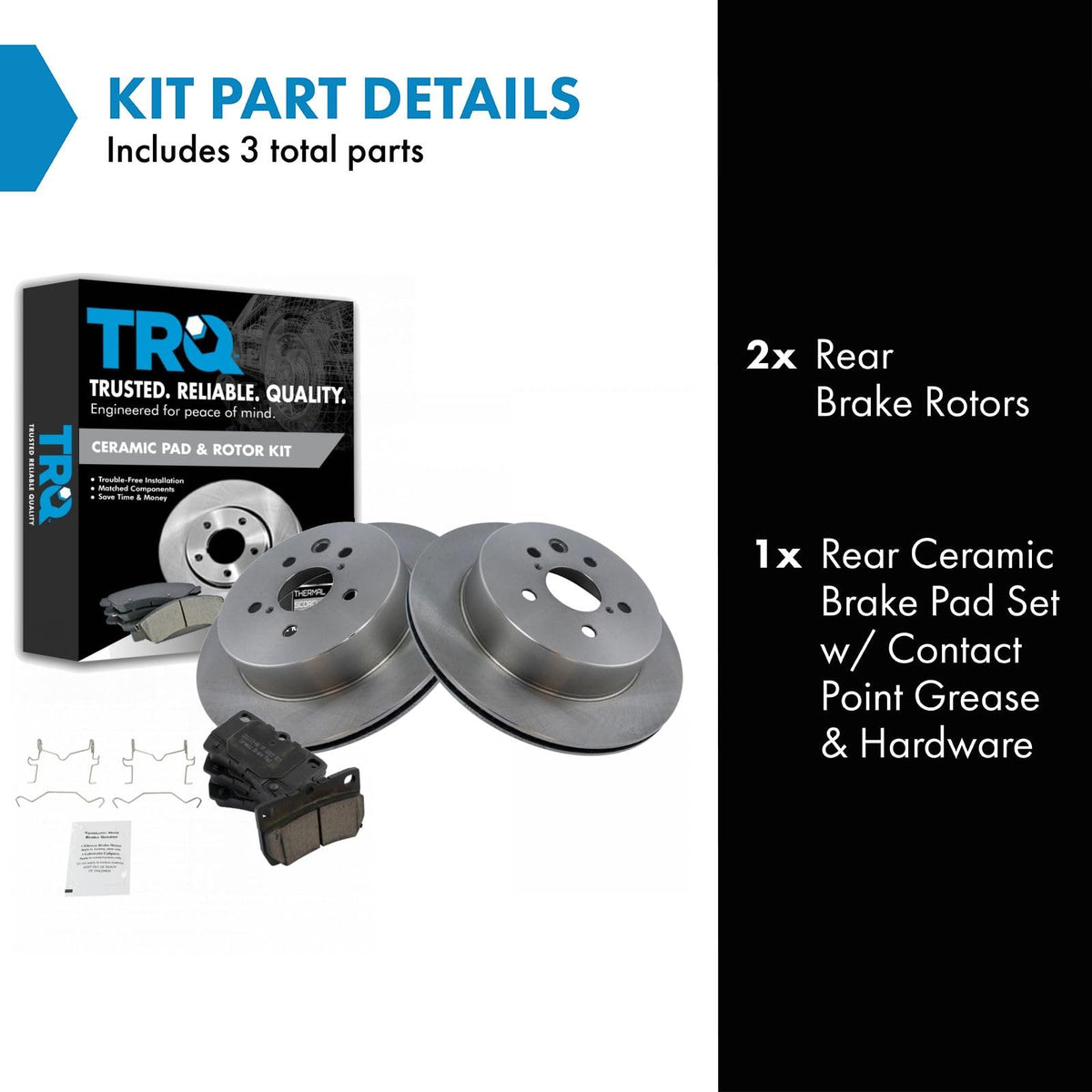 Ceramic Brake Pad & Rotor KitKit Includes(1) Rear Ceramic Brake Pad Set(2) Rear Brake RotorsFitmentCompatible with: 2010-13 Lexus IS250 C RearCompatible with: 2011-13 Lexus IS250 Base Model with 12.20 in. 310mm Diameter Rear Rotors RearCompatible with: 2007-11 Lexus GS350 RearCompatible with: 2006-13 Lexus IS350 RearCompatible with: 2006 Lexus GS300 RearCompatible with: 2006-07 Lexus GS430 RearCompatible with: 2007-11 Lexus GS450h RearCompatible with: 2008-11 Lexus GS460 RearProduct AttributesRear Brake Rotor Diameter: 12.20 in. (310mm)Wheel Lug Count: 5 LugBrake Pad Friction Material: CeramicBrake Pad Bonding Type: Premium PosiRear Brake Rotor Venting Type: VentedProduct Features Positive Molded - Less dust resulting in clean wheels G3000 Casting Alloy - Reduced noise and improved wear resistance Application Specific Design - Extended service life, no modificationsItem DetailsTRQ brake kits are designed to restore your brake system to like-new performance. TRQ brake pads are positive molded, thermal scorched, chamfered, and utilize a multi-layer shim for enhanced performance and service life. TRQ rotors have a non-directional finish that reduces the break-in period for new rotors as well as reducing vibrations throughout the rotors lifecycle. All products are fit and road-tested in our Massachusetts R&D facility to ensure we deliver on our promise of Trusted Reliable Quality.Reference NumbersAimco: 31446Bendix: PRT5940DuraGo: BR900548Hollander: 533-50103Lexus: 446622190, 446630210, 446653010Raybestos Brakes: 980488, 980488FZN, 980488P, 980488R, EHT1113H, MGD1113CHWagner: BD180047