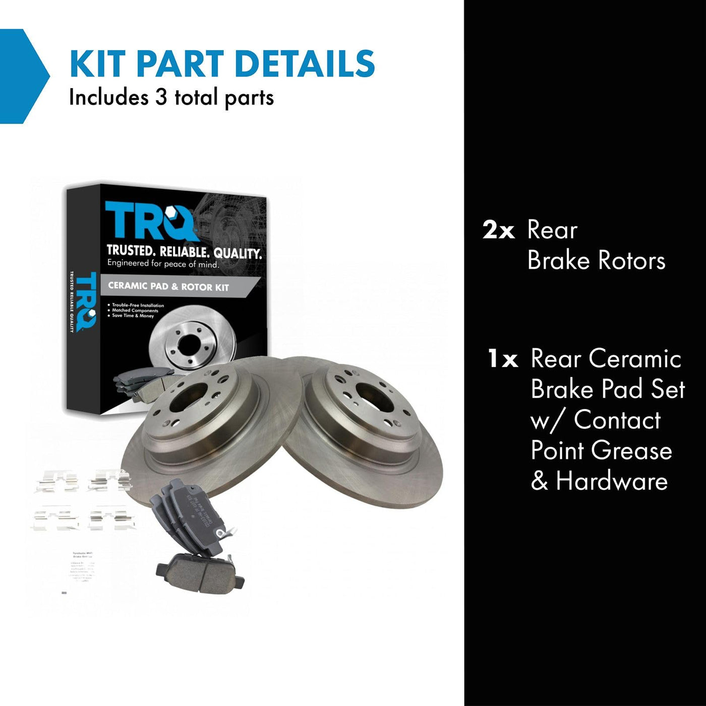Ceramic Brake Pad & Rotor KitKit Includes(1) Rear Ceramic Brake Pad Set(2) Rear Brake RotorsFitmentCompatible with: 2009-14 Acura TL RearProduct AttributesRear Brake Rotor Diameter: 13.15 in. (334mm)Wheel Lug Count: 5 LugBrake Pad Friction Material: CeramicRear Brake Rotor Venting Type: VentedProduct Features Positive Molded - Less dust resulting in clean wheels G3000 Casting Alloy - Reduced noise and improved wear resistance Application Specific Design - Extended service life, no modificationsItem DetailsTRQ brake kits are designed to restore your brake system to like-new performance. TRQ brake pads are positive molded, thermal scorched, chamfered, and utilize a multi-layer shim for enhanced performance and service life. TRQ rotors have a non-directional finish that reduces the break-in period for new rotors as well as reducing vibrations throughout the rotors lifecycle. All products are fit and road-tested in our Massachusetts R&D facility to ensure we deliver on our promise of Trusted Reliable Quality.Reference NumbersAcura: 43022TK4A00Aimco: 31539Bendix: PRT6084DuraGo: BR900834Hollander: 533-50252Honda: 43022SJCA00, 43022SJCA50, 43022TK4A00Raybestos Brakes: 980739, 980739FZN, 980739P, 980739R, EHT1103H, MGD1103CH, SGD1103CWagner: BD180290