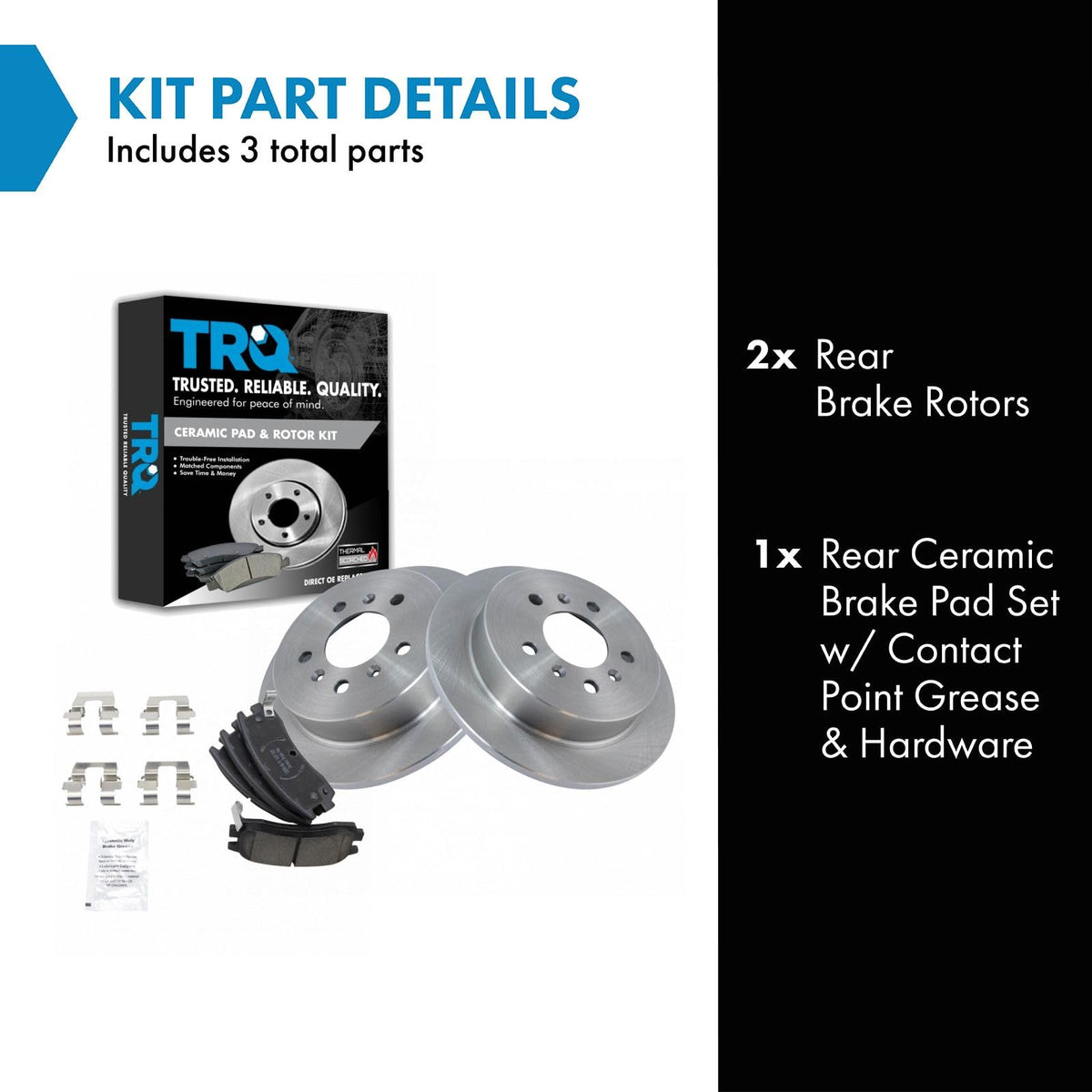 Ceramic Brake Pad & Rotor KitKit Includes(1) Rear Ceramic Brake Pad Set(2) Rear Brake RotorsFitmentCompatible with: 2006-09 Chevrolet Impala Rear Driver & Passenger SideCompatible with: 2010 Chevrolet Impala without Integrated Parking Brake Rear Driver & Passenger SideCompatible with: 2006-07 Chevrolet Monte Carlo Rear Driver & Passenger SideCompatible with: 2009 Buick LaCrosse with Special Ride & Handling Suspension Package Rear Driver & Passenger SideProduct AttributesRear Brake Rotor Diameter: 10.94 in. (278mm)Wheel Lug Count: 5 LugBrake Pad Friction Material: CeramicBrake Pad Bonding Type: Premium PosiRear Brake Rotor Venting Type: SolidProduct Features Positive Molded - Less dust resulting in clean wheels G3000 Casting Alloy - Reduced noise and improved wear resistance Application Specific Design - Extended service life, no modificationsItem DetailsTRQ brake kits are designed to restore your brake system to like-new performance. TRQ brake pads are positive molded, thermal scorched, chamfered, and utilize a multi-layer shim for enhanced performance and service life. TRQ rotors have a non-directional finish that reduces the break-in period for new rotors as well as reducing vibrations throughout the rotors lifecycle. All products are fit and road-tested in our Massachusetts R&D facility to ensure we deliver on our promise of Trusted Reliable Quality.Reference NumbersAimco: 55125Bendix: PRT5628Buick: 18023377, 18029844Chevrolet: 18023377DuraGo: BR55125Hollander: 533-02339Oldsmobile: 18023377, 18029844Pontiac: 18023377, 18029844Raybestos Brakes: 580401, 580401FZN, 580401P, 580401PER, 580401R, EHT698H, MGD698CH, SGD698CWagner: BD126348