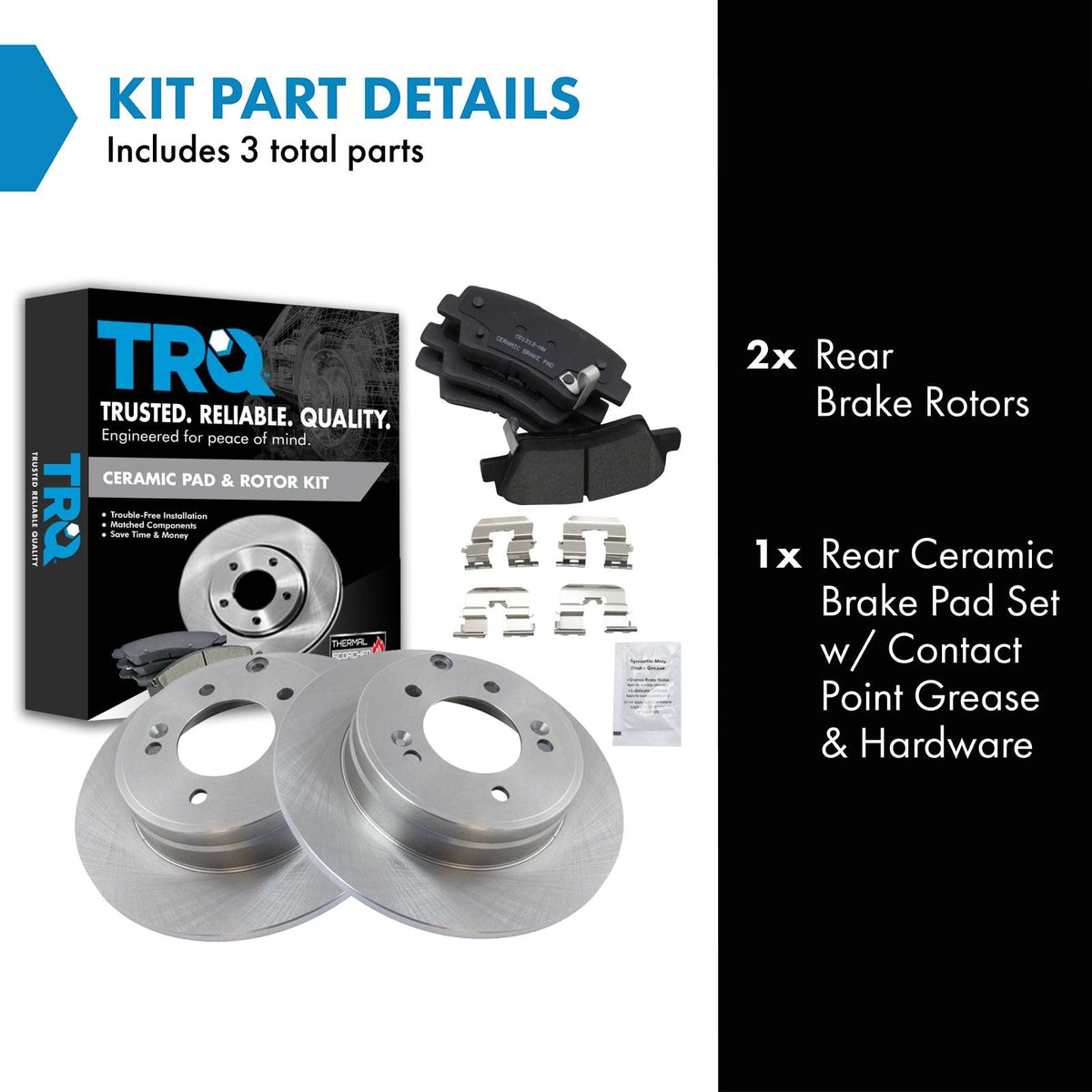 Ceramic Brake Pad & Rotor KitKit Includes(1) Rear Ceramic Brake Pad Set(2) Rear Brake RotorsFitmentCompatible with: 2009-10 Hyundai Sonata V6 3.3L RearCompatible with: 2010-11 Hyundai Azera RearProduct AttributesRear Brake Rotor Diameter: 11.14 in. (283mm)Wheel Lug Count: 5 LugBrake Pad Friction Material: CeramicBrake Pad Bonding Type: Premium PosiRear Brake Rotor Venting Type: VentedProduct Features Positive Molded - Less dust resulting in clean wheels G3000 Casting Alloy - Reduced noise and improved wear resistance Application Specific Design - Extended service life, no modificationsItem DetailsTRQ brake kits are designed to restore your brake system to like-new performance. TRQ brake pads are positive molded, thermal scorched, chamfered, and utilize a multi-layer shim for enhanced performance and service life. TRQ rotors have a non-directional finish that reduces the break-in period for new rotors as well as reducing vibrations throughout the rotors lifecycle. All products are fit and road-tested in our Massachusetts R&D facility to ensure we deliver on our promise of Trusted Reliable Quality.Reference NumbersAimco: 31424Bendix: PRT5846DuraGo: BR31424Hollander: 533-50114, 533-50223, 533-50292Kia: 583023FA01Raybestos Brakes: 980420, 980420FZN, 980420P, 980420R, 980902, 980902FZN, 980902P, 980902R, EHT1313H, MGD1313CH, SGD1313CWagner: BD126458