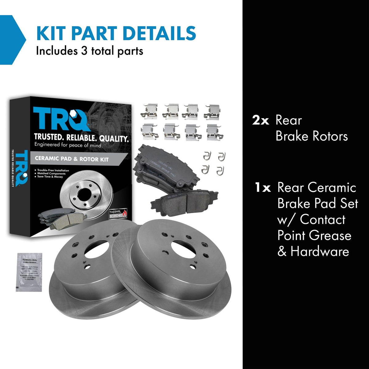 Ceramic Brake Pad & Rotor KitKit Includes(1) Rear Ceramic Brake Pad Set(2) Rear Brake RotorsFitmentCompatible with: 2015-19 Toyota Highlander RearCompatible with: 2011-20 Toyota Sienna RearCompatible with: 2010-15 Lexus RX350 RearCompatible with: 2014 Toyota Highlander LE RearCompatible with: 2014 Toyota Highlander LE Plus RearCompatible with: 2014 Toyota Highlander Limited RearCompatible with: 2014 Toyota Highlander XLE RearCompatible with: 2010-15 Lexus RX450h RearProduct AttributesRear Brake Rotor Diameter: 12.13 in. (308mm)Wheel Lug Count: 5 LugBrake Pad Friction Material: CeramicBrake Pad Bonding Type: Premium PosiRear Brake Rotor Venting Type: SolidProduct Features Positive Molded - Less dust resulting in clean wheels G3000 Casting Alloy - Reduced noise and improved wear resistance Application Specific Design - Extended service life, no modificationsItem DetailsTRQ brake kits are designed to restore your brake system to like-new performance. TRQ brake pads are positive molded, thermal scorched, chamfered, and utilize a multi-layer shim for enhanced performance and service life. TRQ rotors have a non-directional finish that reduces the break-in period for new rotors as well as reducing vibrations throughout the rotors lifecycle. All products are fit and road-tested in our Massachusetts R&D facility to ensure we deliver on our promise of Trusted Reliable Quality.Reference NumbersAimco: 31544Bendix: PRT6001DuraGo: BR901006Lexus: 446630280, 446630300, 446630310, 446630311, 446630312, 446648130Raybestos Brakes: 980757, 980757FZN, 980757P, 980757R, EHT1391AH, EHT1391H, MGD1391CHToyota: 446647050, 446647051, 446647071Wagner: BD180361