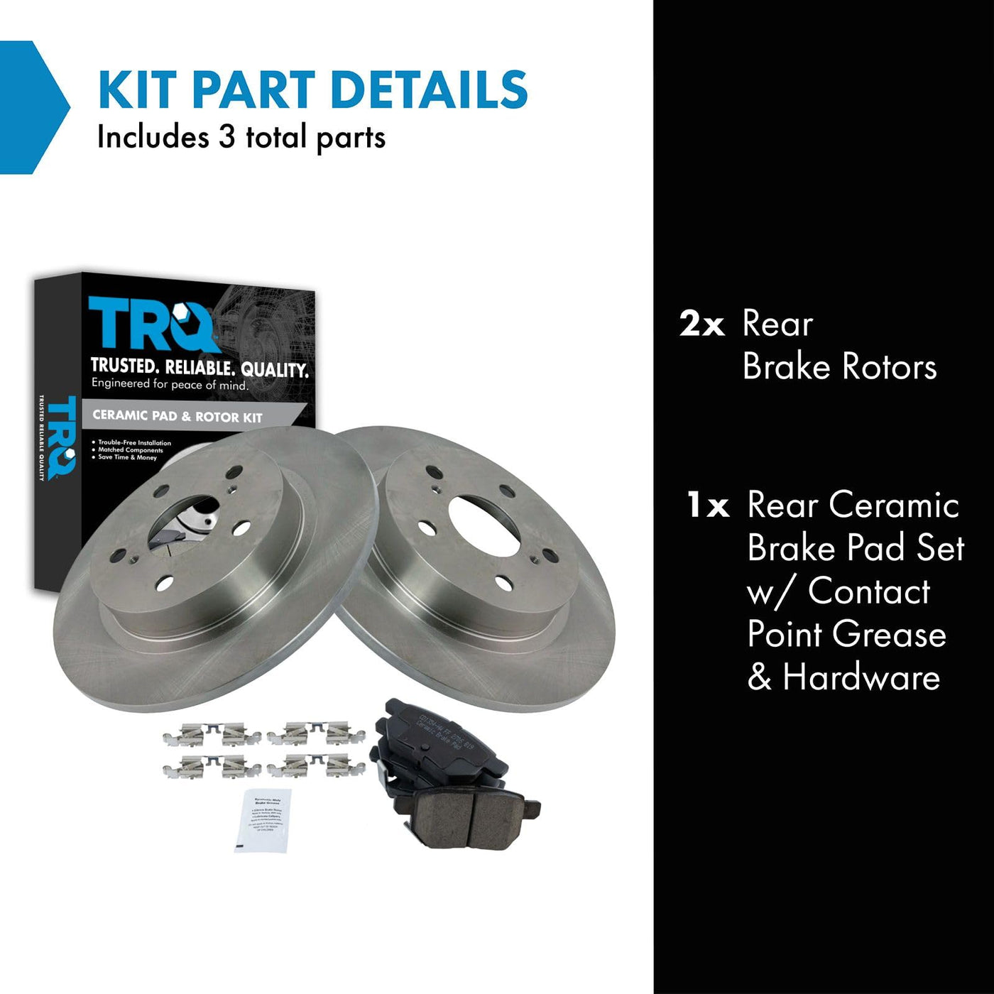 Ceramic Brake Pad & Rotor KitKit Includes(1) Rear Ceramic Brake Pad Set(2) Rear Brake RotorsFitmentCompatible with: 2011-16 Scion tC RearProduct AttributesRear Brake Rotor Diameter: 10.98 in. (279mm)Wheel Lug Count: 5 LugBrake Pad Friction Material: CeramicRear Brake Rotor Venting Type: SolidProduct Features Positive Molded - Less dust resulting in clean wheels G3000 Casting Alloy - Reduced noise and improved wear resistance Application Specific Design - Extended service life, no modificationsItem DetailsTRQ brake kits are designed to restore your brake system to like-new performance. TRQ brake pads are positive molded, thermal scorched, chamfered, and utilize a multi-layer shim for enhanced performance and service life. TRQ rotors have a non-directional finish that reduces the break-in period for new rotors as well as reducing vibrations throughout the rotors lifecycle. All products are fit and road-tested in our Massachusetts R&D facility to ensure we deliver on our promise of Trusted Reliable Quality.Reference NumbersAimco: 31567Bendix: PRT6118DuraGo: BR901146Pontiac: 19184919Raybestos Brakes: 980862, 980862FZN, 980862P, 980862R, EHT1354H, MGD1354CH, SGD1354CScion: 446612130, 446612150, 446621020, 446652150Toyota: 446602210, 446602260, 446602310, 446647110, 446652140, 446652170Wagner: BD180448
