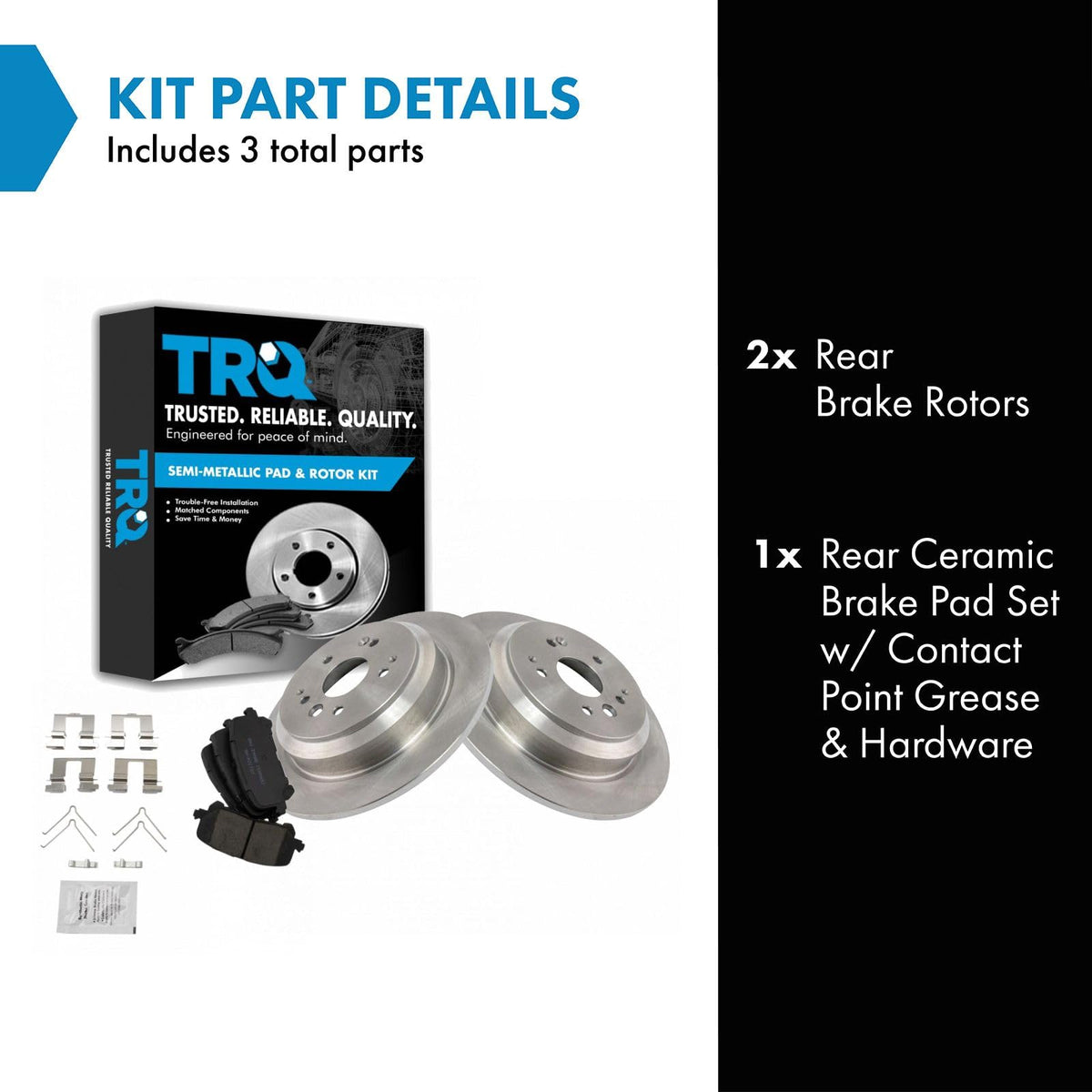 Ceramic Brake Pad & Rotor KitKit Includes(1) Rear Ceramic Brake Pad Set with Contact Point Grease & Hardware(2) Rear Brake RotorsFitmentCompatible with: 2014-16 Acura MDX RearProduct AttributesRear Brake Rotor Diameter: 12.99 in. (330mm)Wheel Lug Count: 5 LugBrake Pad Friction Material: CeramicBrake Pad Bonding Type: Premium PosiRear Brake Rotor Venting Type: SolidProduct Features Positive Molded - Less dust resulting in clean wheels G3000 Casting Alloy - Reduced noise and improved wear resistance Application Specific Design - Extended service life, no modificationsItem DetailsTRQ brake kits are designed to restore your brake system to like-new performance. TRQ brake pads are positive molded, thermal scorched, chamfered, and utilize a multi-layer shim for enhanced performance and service life. TRQ rotors have a non-directional finish that reduces the break-in period for new rotors as well as reducing vibrations throughout the rotors lifecycle. All products are fit and road-tested in our Massachusetts R&D facility to ensure we deliver on our promise of Trusted Reliable Quality.Reference NumbersAcura: 43022TZ5A00, 43022TZ5A01Aimco: 45697DuraGo: BR901320Honda: 43022TZ5A01Raybestos Brakes: 981064, 981064FZN, 981064P, 981064PER, 981064R, EHT1724H, MGD1724CHWagner: BD180654