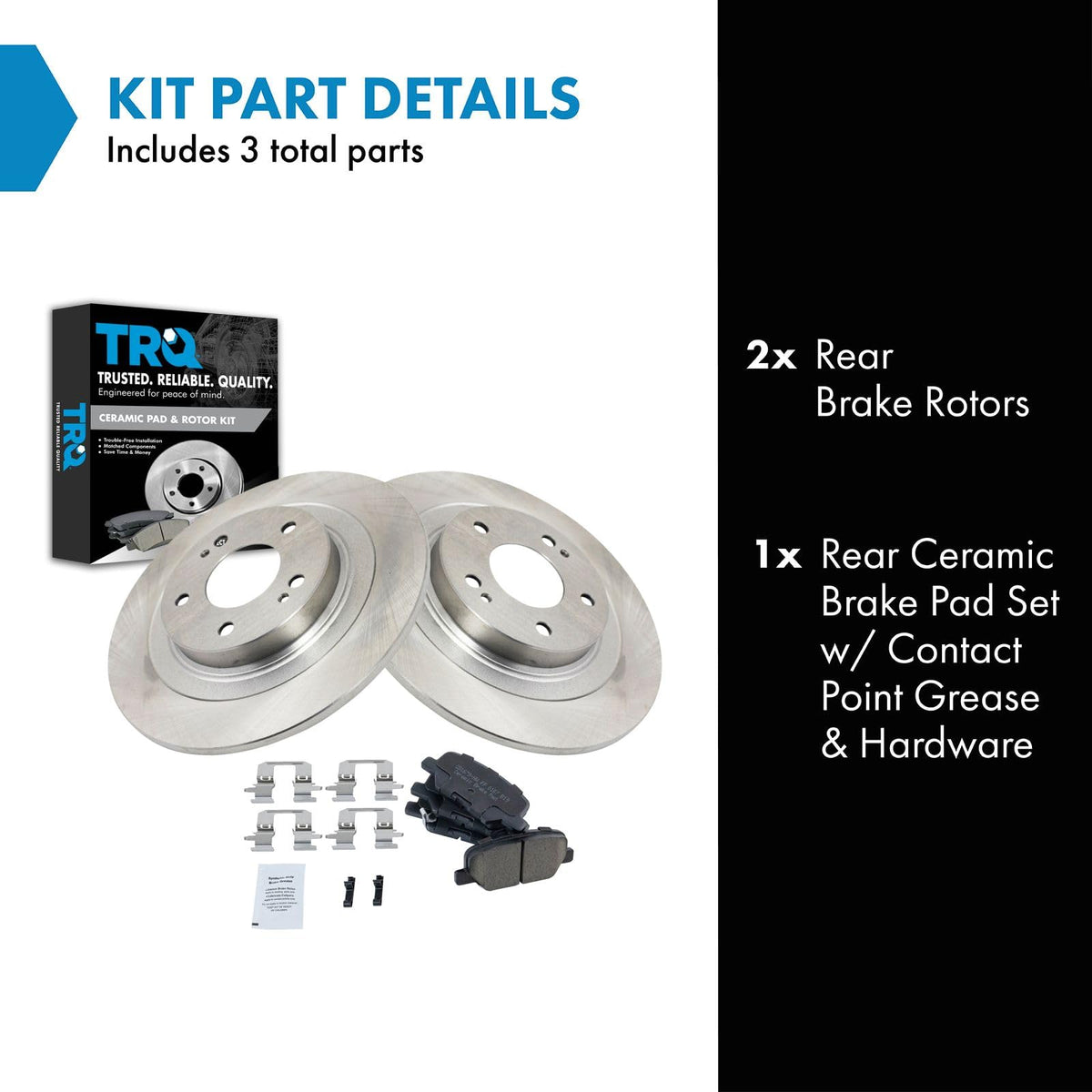 Ceramic Brake Pad & Rotor KitKit Includes(1) Rear Ceramic Brake Pad Set(2) Rear Brake RotorsFitmentCompatible with: 2013-20 Mitsubishi Outlander Sport RearCompatible with: 2017-19 Mitsubishi Outlander with Manual Parking Brake RearCompatible with: 2014-16 Mitsubishi Outlander RearProduct AttributesRear Brake Rotor Diameter: 11.89 in. (302mm)Wheel Lug Count: 5 LugBrake Pad Friction Material: CeramicBrake Pad Bonding Type: Premium PosiRear Brake Rotor Venting Type: SolidProduct Features Positive Molded - Less dust resulting in clean wheels G3000 Casting Alloy - Reduced noise and improved wear resistance Application Specific Design - Extended service life, no modificationsItem DetailsTRQ brake kits are designed to restore your brake system to like-new performance. TRQ brake pads are positive molded, thermal scorched, chamfered, and utilize a multi-layer shim for enhanced performance and service life. TRQ rotors have a non-directional finish that reduces the break-in period for new rotors as well as reducing vibrations throughout the rotors lifecycle. All products are fit and road-tested in our Massachusetts R&D facility to ensure we deliver on our promise of Trusted Reliable Quality.Reference NumbersDuraGo: BR901520Mazda: BJY72648Z, BJY72648ZA, GHY92648Z, GHY92648ZCMitsubishi: 4605A802, 4605B070, 4615A168Raybestos Brakes: 981056, 981056FZN, 981056P, 981056R, EHT1679H, MGD1679CH, SGD1679CWagner: BD180598