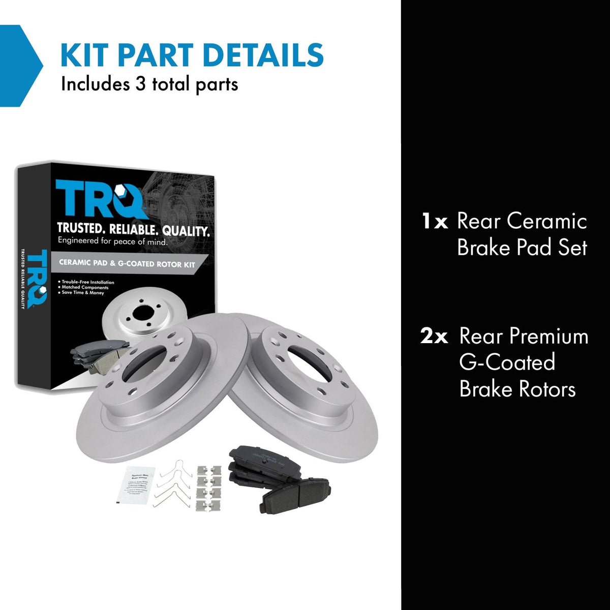 Ceramic Brake Pad & Rotor KitKit Includes(1) Rear Ceramic Brake Pad Set(2) Rear Premium G-Coated Brake RotorsFitmentCompatible with: 2003-05 Mazda 6 Rear Ceramic Premium G-Coated Brake Pad & Rotor KitCompatible with: 2003 Mazda Protege MazdaSpeed Rear Ceramic Premium G-Coated Brake Pad & Rotor KitProduct AttributesBrake Pad Friction Material: CeramicBrake Rotor Coating: Premium G-CoatedBrake Pad Bonding Type: Premium PosiProduct Features Positive Molded: Less dust resulting in clean wheels Electrostatic Coated: Long-lasting rust protection G3000 Casting Alloy: Reduced noise and improved wear resistance Application Specific Design: Extended service life, no modificationsItem DetailsTRQ brake kits are designed to restore your brake system to like-new performance. TRQ brake pads are positive molded, thermal scorched, chamfered, and utilize a multi-layer shim for enhanced performance and service life. TRQ G-coated rotors have long-lasting rust prevention, perfect for wheels with large openings that expose the rotor and rotor hat during daily drives. All products are fit and road-tested in our Massachusetts R&D facility to ensure we deliver on our promise of Trusted Reliable Quality.Reference NumbersMazda: FB0649280A, FDY12643Z, GGYB2648Z, GKYA2643ZRaybestos Brakes: EHT482H, MGD482CH, SGD482C