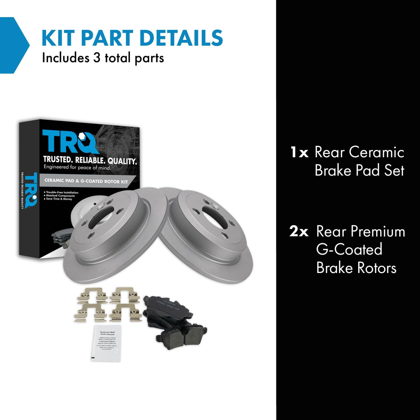Ceramic Brake Pad & Rotor KitKit Includes(1) Rear Ceramic Brake Pad Set(2) Rear Premium G-Coated Brake RotorsFitmentCompatible with: 2009-15 Mini Cooper Base Model Rear Ceramic Premium G-Coated Brake Pad & Rotor KitCompatible with: 2008-15 Mini Cooper Clubman Rear Ceramic Premium G-Coated Brake Pad & Rotor KitCompatible with: 2012-15 Mini Cooper Roadster Rear Ceramic Premium G-Coated Brake Pad & Rotor KitCompatible with: 2012-15 Mini Cooper Coupe Rear Ceramic Premium G-Coated Brake Pad & Rotor KitProduct AttributesRear Brake Rotor Diameter: 10.20 in. (259mm)Wheel Lug Count: 4 LugBrake Pad Friction Material: CeramicBrake Rotor Coating: Premium G-CoatedBrake Pad Bonding Type: Premium PosiRear Brake Rotor Venting Type: SolidProduct Features Positive Molded: Less dust resulting in clean wheels Electrostatic Coated: Long-lasting rust protection G3000 Casting Alloy: Reduced noise and improved wear resistance Application Specific Design: Extended service life, no modificationsItem DetailsTRQ brake kits are designed to restore your brake system to like-new performance. TRQ brake pads are positive molded, thermal scorched, chamfered, and utilize a multi-layer shim for enhanced performance and service life. TRQ G-coated rotors have long-lasting rust prevention, perfect for wheels with large openings that expose the rotor and rotor hat during daily drives. All products are fit and road-tested in our Massachusetts R&D facility to ensure we deliver on our promise of Trusted Reliable Quality.Reference NumbersMini: 34216778327, 34216794059Raybestos Brakes: EHT1309H