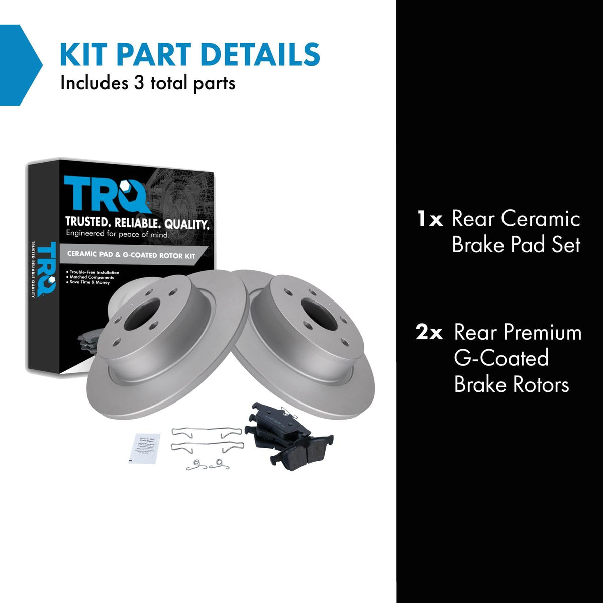 Ceramic Brake Pad & Rotor KitKit Includes(1) Rear Ceramic Brake Pad Set(2) Rear Premium G-Coated Brake RotorsFitmentCompatible with: 2013-16 Ford Escape Rear Ceramic Premium G-Coated Brake Pad & Rotor KitCompatible with: 2014-18 Ford Transit Connect Rear Ceramic Premium G-Coated Brake Pad & Rotor KitCompatible with: 2013-18 Ford C-Max Rear Ceramic Premium G-Coated Brake Pad & Rotor KitProduct AttributesRear Brake Rotor Diameter: 11.02 in. (280mm)Wheel Lug Count: 5 LugBrake Pad Friction Material: CeramicBrake Rotor Coating: Premium G-CoatedRear Brake Rotor Venting Type: SolidProduct Features Positive Molded: Less dust resulting in clean wheels Electrostatic Coated: Long-lasting rust protection G3000 Casting Alloy: Reduced noise and improved wear resistance Application Specific Design: Extended service life, no modificationsItem DetailsTRQ brake kits are designed to restore your brake system to like-new performance. TRQ brake pads are positive molded, thermal scorched, chamfered, and utilize a multi-layer shim for enhanced performance and service life. TRQ G-coated rotors have long-lasting rust prevention, perfect for wheels with large openings that expose the rotor and rotor hat during daily drives. All products are fit and road-tested in our Massachusetts R&D facility to ensure we deliver on our promise of Trusted Reliable Quality.Reference NumbersAudi: 4B0698151AC, 4B0698151AD, 4B0698151R, 4F0698151A, 8E0698151CChevrolet: 15271565Ford: AV6Z2200AJaguar: C2C27271, C2D23143, C2P17595Mazda: B3YF3323Z, BPYK2648ZB, C2Y32648ZA, C2Y32648ZBPontiac: 15271565Raybestos Brakes: EHT1095H, MGD1095CHSaab: 93166942, 93183140, 93190338, 93195754Saturn: 15271565Volkswagen: 1K0698151BVolvo: 307420290, 30742031, 307420310, 31212184