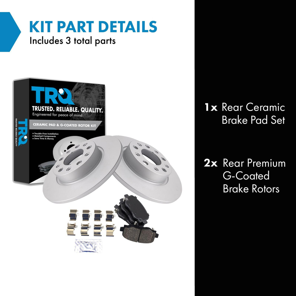 Ceramic Brake Pad & Rotor KitKit Includes(1) Rear Ceramic Brake Pad Set(2) Rear Premium G-Coated Brake RotorsFitmentCompatible with: 2015-21 Jeep Renegade Rear Ceramic Premium G-Coated Brake Pad & Rotor KitCompatible with: 2016-21 Fiat 500X Rear Ceramic Premium G-Coated Brake Pad & Rotor KitProduct AttributesRear Brake Rotor Diameter: 10.94 in. (278mm)Wheel Lug Count: 5 LugBrake Pad Friction Material: CeramicBrake Rotor Coating: Premium G-CoatedBrake Pad Bonding Type: Premium PosiRear Brake Rotor Venting Type: SolidProduct Features Positive Molded: Less dust resulting in clean wheels Electrostatic Coated: Long-lasting rust protection G3000 Casting Alloy: Reduced noise and improved wear resistance Application Specific Design: Extended service life, no modificationsItem DetailsTRQ brake kits are designed to restore your brake system to like-new performance. TRQ brake pads are positive molded, thermal scorched, chamfered, and utilize a multi-layer shim for enhanced performance and service life. TRQ G-coated rotors have long-lasting rust prevention, perfect for wheels with large openings that expose the rotor and rotor hat during daily drives. All products are fit and road-tested in our Massachusetts R&D facility to ensure we deliver on our promise of Trusted Reliable Quality.Reference NumbersFiat: 68263132AAJeep: 68263132AA, 68289634AARaybestos Brakes: EHT1809H, MGD1809CH