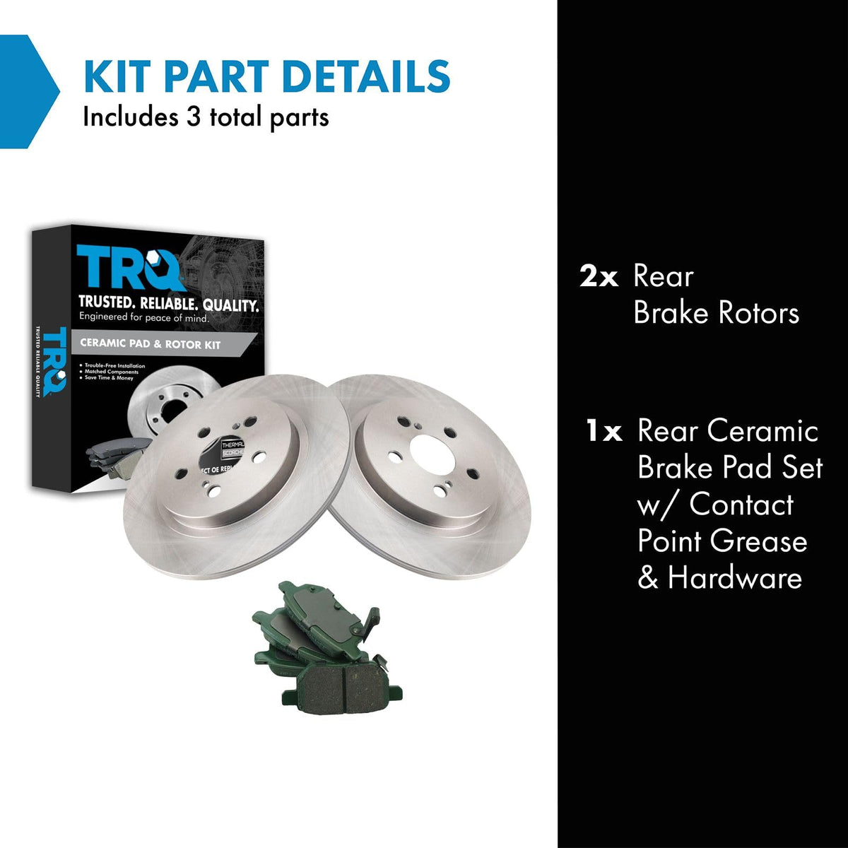 Ceramic Brake Pad & Rotor KitKit Includes(1) Rear Ceramic Brake Pad Set(2) Rear Brake RotorsFitmentCompatible with: 2011-13 Lexus CT200h with 10.98 in. 279mm Diameter Rear Rotors RearCompatible with: 2014-17 Lexus CT200h RearProduct AttributesBrake Rotor Diameter: 10.98 in. (279mm)Wheel Lug Count: 5 LugBrake Pad Friction Material: CeramicBrake Pad Bonding Type: Premium PosiBrake Rotor Venting Type: SolidProduct Features Positive Molded - Less dust resulting in clean wheels G3000 Casting Alloy - Reduced noise and improved wear resistance Application Specific Design - Extended service life, no modificationsItem DetailsTRQ brake kits are designed to restore your brake system to like-new performance. TRQ brake pads are positive molded, thermal scorched, chamfered, and utilize a multi-layer shim for enhanced performance and service life. TRQ rotors have a non-directional finish that reduces the break-in period for new rotors as well as reducing vibrations throughout the rotors lifecycle. All products are fit and road-tested in our Massachusetts R&D facility to ensure we deliver on our promise of Trusted Reliable Quality.Reference NumbersAamco: 31591Advance Auto Parts: YH321428PAimco: 31591Autopartsource: 479745Autoxtra: AX901016AutoZone: 71919, 71919DGBendix: PRT6142BrakeBest: 980916R, 980916RGSCentric Parts: 120.44173, 121.44173, 126.44173SL, 126.44173SR, 127.44173L, 127.44173R, 128.44173L, 128.44173R, 320.44173Dura Corp: BR901016DuraGo: BR901016Lexus: 446647030, 446676011, 446676012NAPA BRAKES: SDK6743Newtek Automotive USA: 31591PowerStop: JBR1560EVCRaybestos Brakes: 980916, 980916RScion: 446676012Toyota: 4243152160, 446647020, 446647030, 446647060, 446647061, 446647100, 446676012UAP: R44173Wagner Brake: BD180447