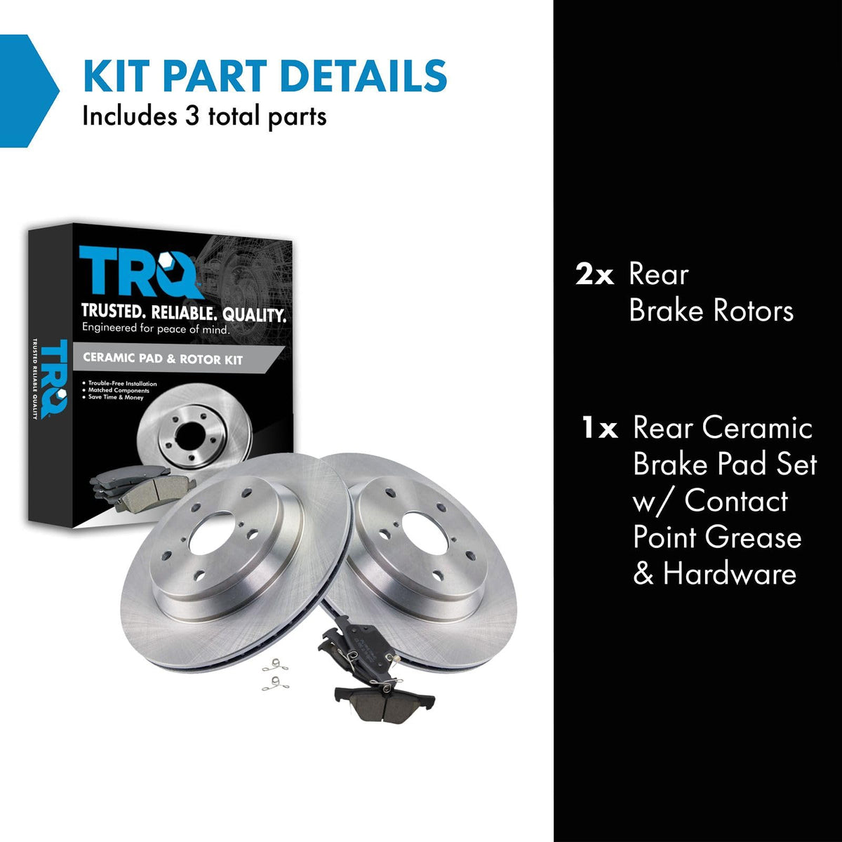 Ceramic Brake Pad & Rotor KitKit Includes(1) Rear Ceramic Brake Pad Set(2) Rear Brake RotorsFitmentCompatible with: 2019-22 Subaru Forester RearProduct AttributesBrake Rotor Diameter: 11.22 in. (285mm)Wheel Lug Count: 5 LugBrake Pad Friction Material: CeramicBrake Pad Bonding Type: Premium PosiBrake Rotor Venting Type: VentedProduct Features Positive Molded - Less dust resulting in clean wheels G3000 Casting Alloy - Reduced noise and improved wear resistance Application Specific Design - Extended service life, no modificationsItem DetailsTRQ brake kits are designed to restore your brake system to like-new performance. TRQ brake pads are positive molded, thermal scorched, chamfered, and utilize a multi-layer shim for enhanced performance and service life. TRQ rotors have a non-directional finish that reduces the break-in period for new rotors as well as reducing vibrations throughout the rotors lifecycle. All products are fit and road-tested in our Massachusetts R&D facility to ensure we deliver on our promise of Trusted Reliable Quality.Reference NumbersBrakeBest: 982566RGSCentric Parts: 120.47045, 121.47045Durabrake: BR901778Raybestos Brakes: 982566, 982566FZN, 982566R, EHT1808Subaru: 26696AL000, 26696AL01A, 26700SJ000