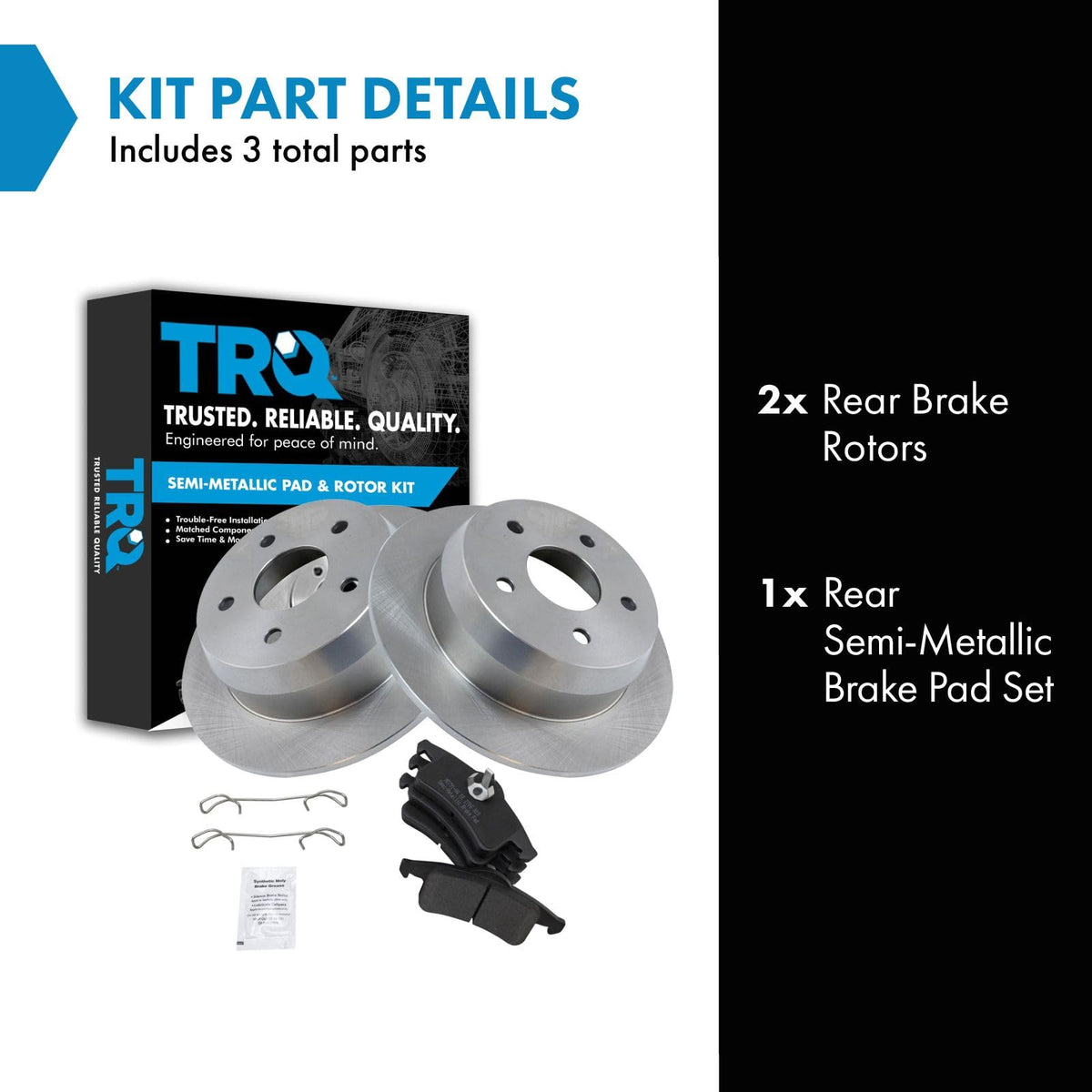Semi-Metallic Brake Pad & Rotor KitKit Includes(1) Rear Semi-Metallic Brake Pad Set(2) Rear Brake RotorsFitmentCompatible with: 1999-04 Jeep Grand Cherokee RearProduct AttributesRear Brake Rotor Diameter: 12.01 in. (305mm)Wheel Lug Count: 5 LugBrake Pad Bonding Type: Premium PosiBrake Pad Friction Material: Semi-MetallicRear Brake Rotor Venting Type: SolidProduct Features Positive Molded - Less dust resulting in clean wheels G3000 Casting Alloy - Reduced noise and improved wear resistance Application Specific Design - Extended service life, no modificationsItem DetailsTRQ brake kits are designed to restore your brake system to like-new performance. TRQ brake pads are positive molded, thermal scorched, chamfered, and utilize a multi-layer shim for enhanced performance and service life. TRQ rotors have a non-directional finish that reduces the break-in period for new rotors as well as reducing vibrations throughout the rotors lifecycle. All products are fit and road-tested in our Massachusetts R&D facility to ensure we deliver on our promise of Trusted Reliable Quality.Reference NumbersAimco: 5119Bendix: PRT5253DuraGo: BR5119Hollander: 533-02388Jeep: 05011970AA, 05011970ABRaybestos Brakes: 76794, 76794FZN, 76794P, 76794PER, 76794R, EHT791HWagner: BD125673