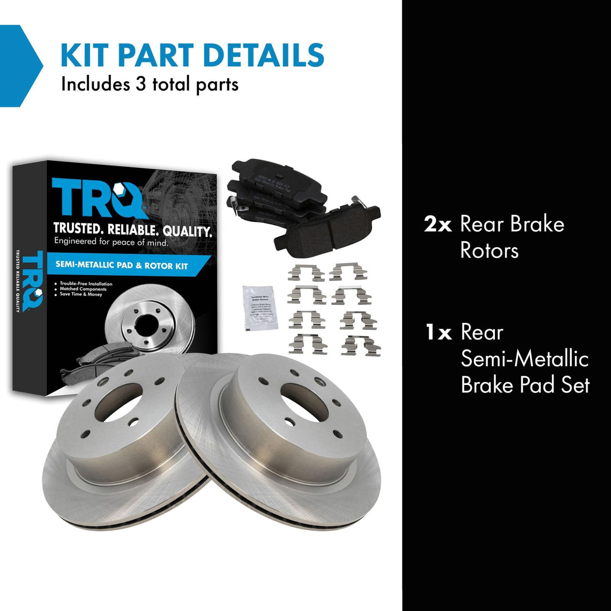 Semi-Metallic Brake Pad & Rotor KitKit Includes(1) Rear Semi-Metallic Brake Pad Set(2) Rear Brake RotorsFitmentCompatible with: 2008-17 Nissan Rogue RearCompatible with: 2018 Nissan Rogue Rear with Manual Parking BrakeCompatible with: 2019 Nissan Rogue SV Hybrid Rear with Manual Parking BrakeCompatible with: 2019 Nissan Rogue SL Hybrid Rear with Manual Parking BrakeCompatible with: 2019 Nissan Rogue SV Rear with Manual Parking BrakeCompatible with: 2019 Nissan Rogue S Rear with Manual Parking BrakeCompatible with: 2020 Nissan Rogue Rear with Manual Parking BrakeCompatible with: 2017-18 Nissan Rogue Sport RearCompatible with: 2014-15 Nissan Rogue Select RearCompatible with: 2021-22 Nissan Rogue Sport SV Rear with Manual Parking Brake with Vented Rear RotorsCompatible with: 2021-22 Nissan Rogue Sport S Rear with Manual Parking Brake with Vented Rear RotorsCompatible with: 2003-04 Infiniti G35 Rear with Single Piston Rear CalipersCompatible with: 2020 Nissan Rogue Sport Rear with Manual Parking BrakeCompatible with: 2019 Nissan Rogue Sport S Rear with Manual Parking BrakeCompatible with: 2019 Nissan Rogue Sport SV Rear with Manual Parking BrakeCompatible with: 2011-16 Nissan Leaf RearCompatible with: 2003-05 Nissan 350Z Rear with Single Piston Rear CalipersCompatible with: 2017-21 Nissan Leaf Rear with Manual Parking BrakeCompatible with: 2005 Infiniti G35 All Wheel Drive RearCompatible with: 2022-23 Nissan Leaf Rear with Manual Parking Brake with Vented Rear RotorsProduct AttributesRear Brake Rotor Diameter: 11.50 in. (292mm)Wheel Lug Count: 5 LugBrake Pad Bonding Type: Premium PosiBrake Pad Friction Material: Semi-MetallicRear Brake Rotor Venting Type: SolidProduct Features Positive Molded - Less dust resulting in clean wheels G3000 Casting Alloy - Reduced noise and improved wear resistance Application Specific Design - Extended service life, no modificationsItem DetailsTRQ brake kits are designed to restore your brake system to like-new performance. TRQ brake pads are positive molded, thermal scorched, chamfered, and utilize a multi-layer shim for enhanced performance and service life. TRQ rotors have a non-directional finish that reduces the break-in period for new rotors as well as reducing vibrations throughout the rotors lifecycle. All products are fit and road-tested in our Massachusetts R&D facility to ensure we deliver on our promise of Trusted Reliable Quality.Reference NumbersAimco: 31349Bendix: PRT5536DuraGo: BR31349INFINITI: 44060AL585, 44060AM485, 44060EG00J, 44060EG00K, 44060EG085Nissan: 440608H385, 44060AL585, 44060AL586, 44060AM485, 44060CB10J, 44060EG00J, D40608H385Raybestos Brakes: 980113, 980113FZN, 980113P, 980113R, EHT905HWagner: BD126093