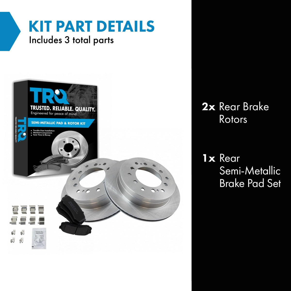 Semi-Metallic Brake Pad & Rotor KitKit Includes(1) Rear Semi-Metallic Brake Pad Set(2) Rear Brake RotorsFitmentCompatible with: 2003-09 Toyota 4Runner RearCompatible with: 2001-07 Toyota Sequoia RearCompatible with: 2007-09 Toyota FJ Cruiser RearCompatible with: 2003-09 Lexus GX470 RearProduct AttributesRear Brake Rotor Diameter: 12.28 in. (312mm)Wheel Lug Count: 6 LugBrake Pad Bonding Type: Premium PosiBrake Pad Friction Material: Semi-MetallicRear Brake Rotor Venting Type: VentedProduct Features Positive Molded - Less dust resulting in clean wheels G3000 Casting Alloy - Reduced noise and improved wear resistance Application Specific Design - Extended service life, no modificationsItem DetailsTRQ brake kits are designed to restore your brake system to like-new performance. TRQ brake pads are positive molded, thermal scorched, chamfered, and utilize a multi-layer shim for enhanced performance and service life. TRQ rotors have a non-directional finish that reduces the break-in period for new rotors as well as reducing vibrations throughout the rotors lifecycle. All products are fit and road-tested in our Massachusetts R&D facility to ensure we deliver on our promise of Trusted Reliable Quality.Reference NumbersAimco: 31294Auto Extra: AXMD606Bendix: PRT5330DuraGo: BR31294Lexus: 446660020, 446660060, 446660090, 446660140Raybestos Brakes: 96929, 96929FZN, 96929P, 96929PER, 96929R, EHT606H, SP606TRHToyota: 446660020, 446660060, 446660080, 446660090, 446660140, 449260020Wagner: BD126038