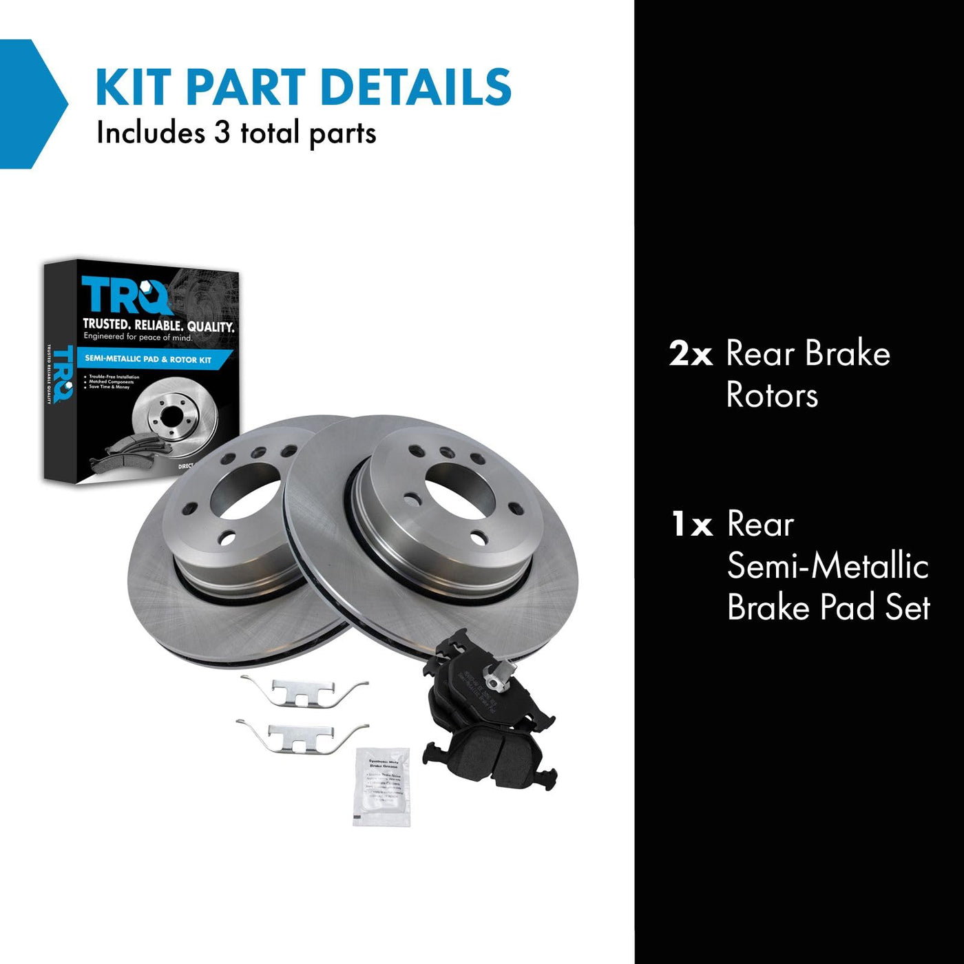 Semi-Metallic Brake Pad & Rotor KitKit Includes(1) Rear Semi-Metallic Brake Pad Set(2) Rear Brake RotorsFitmentCompatible with: 2004-10 BMW X3 RearProduct AttributesRear Brake Rotor Diameter: 12.60 in. (320mm)Wheel Lug Count: 5 LugBrake Pad Bonding Type: Premium PosiBrake Pad Friction Material: Semi-MetallicRear Brake Rotor Venting Type: SolidProduct Features Positive Molded - Less dust resulting in clean wheels G3000 Casting Alloy - Reduced noise and improved wear resistance Application Specific Design - Extended service life, no modificationsItem DetailsTRQ brake kits are designed to restore your brake system to like-new performance. TRQ brake pads are positive molded, thermal scorched, chamfered, and utilize a multi-layer shim for enhanced performance and service life. TRQ rotors have a non-directional finish that reduces the break-in period for new rotors as well as reducing vibrations throughout the rotors lifecycle. All products are fit and road-tested in our Massachusetts R&D facility to ensure we deliver on our promise of Trusted Reliable Quality.Reference NumbersAimco: 34286Auto Extra: AXMD683Bendix: PRT5859BMW: 34211163324, 34211164581, 34211164582, 34213403241, 34216750160, 34216761240, 34216761248, 34216761250DuraGo: BR900558Hollander: 533-59076Land Rover: SFP000120Raybestos Brakes: 980399, 980399FZN, 980399P, 980399R, EHT683Wagner: BD126515