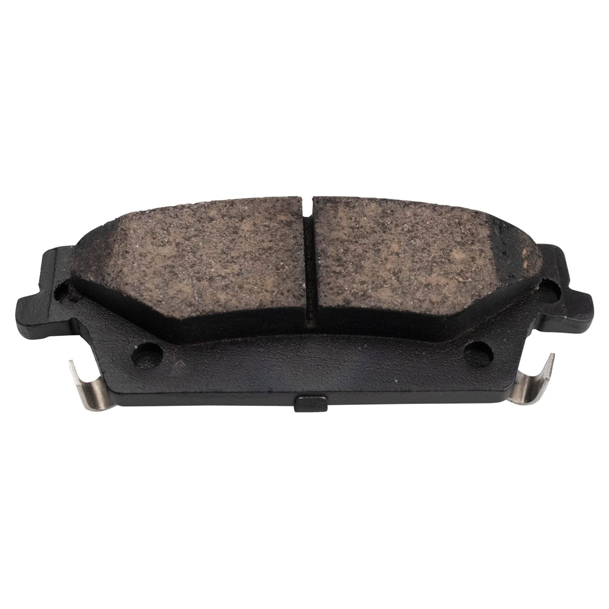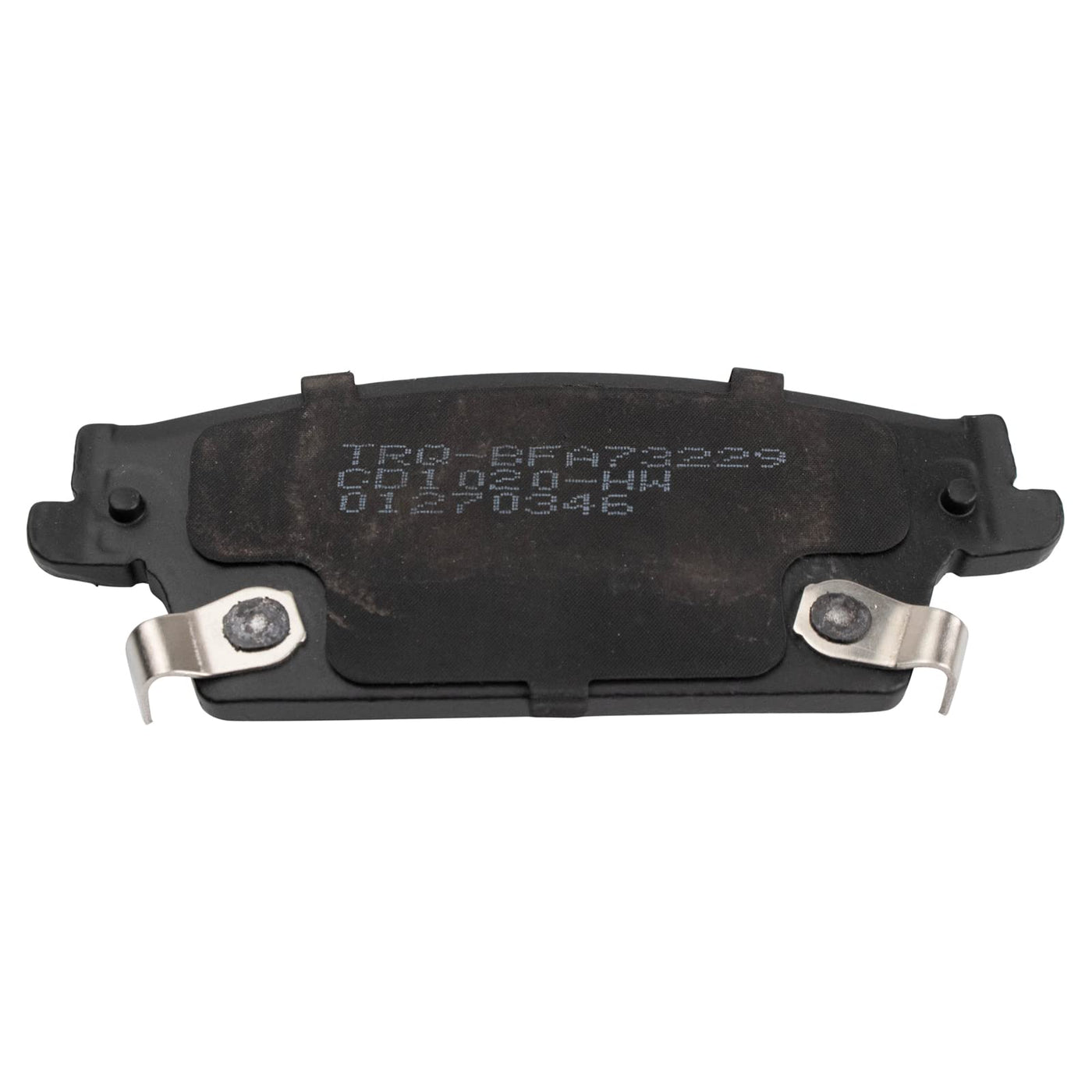 Ceramic Brake PadsFitmentCompatible with: 2004-09 Cadillac SRX with 17 Inch Wheels RearCompatible with: 2010-11 Cadillac STS with RPO Code JE5 4 Wheel ABS Brakes RearProduct AttributesInner Pad Friction Material Thickness: 0.39 inOuter Pad Friction Material Thickness: 0.39 inOuter Pad Overall Thickness: 0.67 inInner Pad Overall Thickness: 0.67 inOuter Pad Height: 1.81 inInner Pad Height: 1.81 inInner Pad Friction Material Thickness: 10 mmOuter Pad Friction Material Thickness: 10 mmOuter Pad Width: 123 mmInner Pad Width: 123 mmOuter Pad Overall Thickness: 17 mmInner Pad Overall Thickness: 17 mmPad Quantity: 4Outer Pad Width: 4.84 inInner Pad Width: 4.84 inOuter Pad Height: 46 mmInner Pad Height: 46 mmBacking Plate Color: BlackPad Shim Color: BlackFriction Material Composition: CeramicPad Shim Material: FiberFriction Material Attachment: Integrally MoldedPad Wear Sensor Type: MechanicalBetter Brakes Law SAE Environmental Compliance Level: NBolts Included: NoAbutment Clips Included: NoBacking Material: SteelWear Indicator Attached: YesPad Shims Included: YesPad Wear Sensor Included: YesChamfered Edges: YesPrepared For Pad Wear Sensor: YesMounting Hardware Included: YesSlotted: YesFriction Surface Scorched: YesBrake Lubricant Included: YesBrake Pad Friction Material: CeramicIncludes: Contact Point GreaseIncludes: HardwareBrake Pad Bonding Type: Premium PosiProduct Features Positive Molded: Less dust resulting in clean wheels Thermal Scorched: Improved stopping performance Application Specific Design: Extended service life, no modifications Hardware and grease included for a complete repair Environmentally Compliant: Meets all Better Brake Law standardsItem DetailsTRQ brake pads are manufactured using premium raw materials and design standards to restore original performance. TRQ brake pads are positive molded and utilize a multi-layer shim for enhanced performance and service life. TRQs combination of materials and design ensures a low dust and low noise braking experience. TRQ recommends replacing your brake rotors when you replace your brake pads to ensure even wear of components and improved braking comfort. All products are fit and road-tested in our Massachusetts R&D facility to ensure we deliver on our promise of Trusted Reliable Quality.Reference NumbersCadillac: 89047757, 89047758Raybestos Brakes: EHT1020H, MGD1020CH, SGD1020C