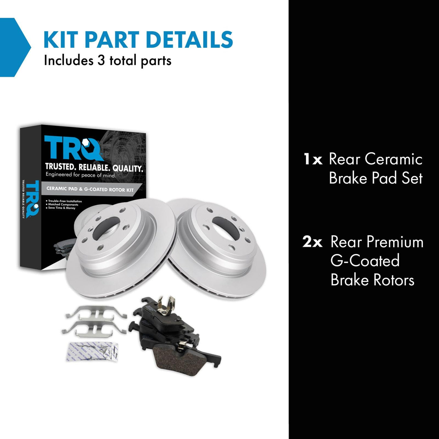 Ceramic Brake Pad & Rotor KitKit Includes(1) Rear Ceramic Brake Pad Set(2) Rear Premium G-Coated Brake RotorsFitmentCompatible with: 2014-15 BMW 328i xDrive Rear without Blue Painted Calipers Ceramic Premium G-Coated Brake Pad & Rotor KitCompatible with: 2014-15 BMW 428i Convertible Rear without Blue Painted Calipers Ceramic Premium G-Coated Brake Pad & Rotor KitCompatible with: 2016 BMW 328i Rear without Blue Painted Calipers without M Sport Package Ceramic Premium G-Coated Brake Pad & Rotor KitCompatible with: 2017-20 BMW 430I xDrive Gran Coupe Rear without Blue Painted Calipers Ceramic Premium G-Coated Brake Pad & Rotor KitCompatible with: 2014-15 BMW 428i xDrive Rear without Blue Painted Calipers Ceramic Premium G-Coated Brake Pad & Rotor KitCompatible with: 2015-16 BMW 428i Gran Coupe Rear without Blue Painted Calipers without M Sport Package Ceramic Premium G-Coated Brake Pad & Rotor KitCompatible with: 2015-16 BMW 428i Gran Coupe Rear without Blue Painted Calipers Ceramic Premium G-Coated Brake Pad & Rotor KitCompatible with: 2015-16 BMW 428i xDrive Gran Coupe Rear without Blue Painted Calipers without M Sport Package Ceramic Premium G-Coated Brake Pad & Rotor KitCompatible with: 2014-15 BMW 328i GT xDrive Rear without Blue Painted Calipers Ceramic Premium G-Coated Brake Pad & Rotor KitCompatible with: 2016 BMW 320i xDrive Rear without Blue Painted Calipers Ceramic Premium G-Coated Brake Pad & Rotor KitCompatible with: 2016 BMW 428i xDrive Rear without Blue Painted Calipers without M Sport Package Ceramic Premium G-Coated Brake Pad & Rotor KitCompatible with: 2016 BMW 328i GT xDrive Rear without Blue Painted Calipers Ceramic Premium G-Coated Brake Pad & Rotor KitCompatible with: 2016 BMW 328i GT xDrive L4 2.0L Rear Ceramic Premium G-Coated Brake Pad & Rotor KitCompatible with: 2016 BMW 328d xDrive Rear Ceramic Premium G-Coated Brake Pad & Rotor KitCompatible with: 2016 BMW 330e Rear Ceramic Premium G-Coated Brake Pad & Rotor KitProduct AttributesBrake Pad Friction Material: CeramicBrake Rotor Coating: Premium G-CoatedBrake Pad Bonding Type: Premium PosiBrake Rotor Venting Type: VentedProduct Features Positive Molded: Less dust resulting in clean wheels Electrostatic Coated: Long-lasting rust protection G3000 Casting Alloy: Reduced noise and improved wear resistance Application Specific Design: Extended service life, no modificationsItem DetailsTRQ brake kits are designed to restore your brake system to like-new performance. TRQ brake pads are positive molded, thermal scorched, chamfered, and utilize a multi-layer shim for enhanced performance and service life. TRQ G-coated rotors have long-lasting rust prevention, perfect for wheels with large openings that expose the rotor and rotor hat during daily drives. All products are fit and road-tested in our Massachusetts R&D facility to ensure we deliver on our promise of Trusted Reliable Quality.Reference NumbersBMW: 34206799809, 34206873094, 34216850569, 34216873093Raybestos Brakes: PGD1613C