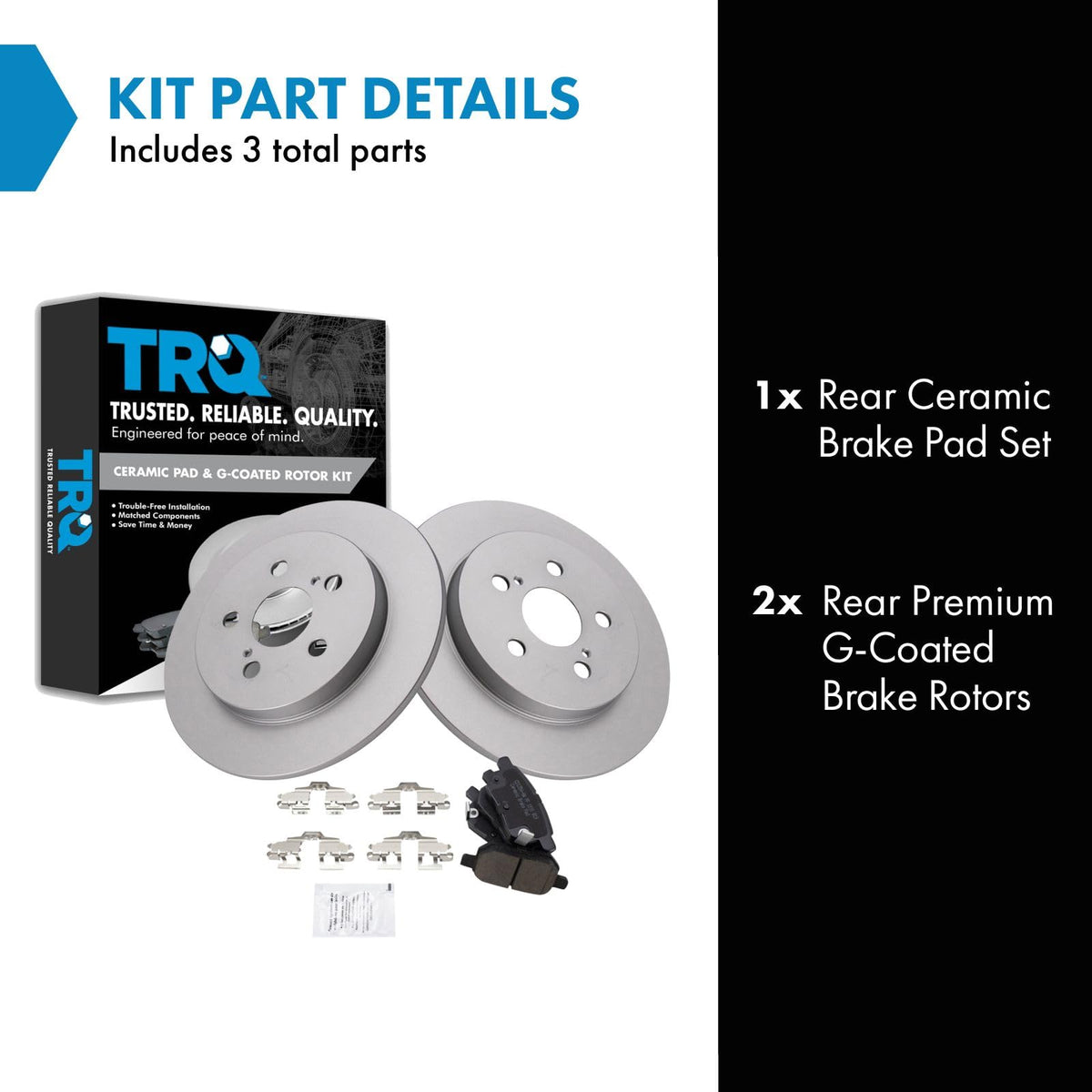 Ceramic Brake Pad & Rotor KitKit Includes(1) Rear Ceramic Brake Pad Set(2) Rear Premium G-Coated Brake RotorsFitmentCompatible with: 2014-16 Toyota Corolla S Rear Ceramic Premium G-Coated Brake Pad & Rotor KitCompatible with: 2017-19 Toyota Corolla XLE Rear Ceramic Premium G-Coated Brake Pad & Rotor KitCompatible with: 2017-19 Toyota Corolla LE Rear Ceramic Premium G-Coated Brake Pad & Rotor KitCompatible with: 2017-19 Toyota Corolla L Rear Ceramic Premium G-Coated Brake Pad & Rotor KitCompatible with: 2009-10 Toyota Corolla XRS Rear Ceramic Premium G-Coated Brake Pad & Rotor KitCompatible with: 2010-11 Toyota Prius Rear Ceramic Premium G-Coated Brake Pad & Rotor KitCompatible with: 2017-22 Toyota Prius Prime Rear Ceramic Premium G-Coated Brake Pad & Rotor KitCompatible with: 2009-13 Toyota Matrix Base Model Rear Ceramic Premium G-Coated Brake Pad & Rotor KitCompatible with: 2020-22 Toyota Prius Rear Ceramic Premium G-Coated Brake Pad & Rotor KitCompatible with: 2009-10 Pontiac Vibe L4 1.8L Rear Ceramic Premium G-Coated Brake Pad & Rotor KitCompatible with: 2011-13 Lexus CT200h Rear with 10.20 in. 259mm Diameter Rear Rotors Ceramic Premium G-Coated Brake Pad & Rotor KitCompatible with: 2019-22 Toyota Prius AWD-e Rear Ceramic Premium G-Coated Brake Pad & Rotor KitCompatible with: 2012-13 Toyota Prius Plug-In Rear Ceramic Premium G-Coated Brake Pad & Rotor KitProduct AttributesRear Brake Rotor Diameter: 10.20 in. (259mm)Wheel Lug Count: 5 LugBrake Pad Friction Material: CeramicBrake Rotor Coating: Premium G-CoatedRear Brake Rotor Venting Type: SolidProduct Features Positive Molded: Less dust resulting in clean wheels Electrostatic Coated: Long-lasting rust protection G3000 Casting Alloy: Reduced noise and improved wear resistance Application Specific Design: Extended service life, no modificationsItem DetailsTRQ brake kits are designed to restore your brake system to like-new performance. TRQ brake pads are positive molded, thermal scorched, chamfered, and utilize a multi-layer shim for enhanced performance and service life. TRQ G-coated rotors have long-lasting rust prevention, perfect for wheels with large openings that expose the rotor and rotor hat during daily drives. All products are fit and road-tested in our Massachusetts R&D facility to ensure we deliver on our promise of Trusted Reliable Quality.Reference NumbersPontiac: 19184919Raybestos Brakes: EHT1354H, MGD1354CH, SGD1354CScion: 446612130, 446612150, 446621020, 446652150Toyota: 446602210, 446602260, 446602310, 446647110, 446652140, 446652170