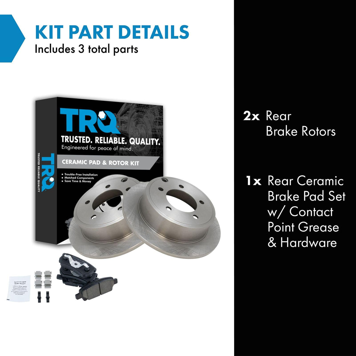 Ceramic Brake Pad & Rotor KitKit Includes(1) Rear Ceramic Brake Pad Set(2) Rear Brake RotorsFitmentCompatible with: 2010-17 Jeep Patriot with 10.3 in. 261mm Diameter Rear Rotors RearCompatible with: 2007-17 Jeep Compass with 10.3 in. 261mm Diameter Rear Rotors RearCompatible with: 2008-14 Dodge Avenger with 10.3 in. 261mm Diameter Rear Rotors RearCompatible with: 2011-14 Chrysler 200 with 10.3 in. 261mm Diameter Rear Rotors RearCompatible with: 2007-09 Dodge Caliber SXT RearCompatible with: 2007-09 Dodge Caliber SE RearCompatible with: 2007-09 Dodge Caliber R/T RearCompatible with: 2008-16 Mitsubishi Lancer ES with 10.3 in. 261mm Diameter Rear Rotors RearCompatible with: 2007-10 Chrysler Sebring with 10.3 in. 261mm Diameter Rear Rotors RearCompatible with: 2008-13 Mitsubishi Lancer DE with 10.3 in. 261mm Diameter Rear Rotors RearCompatible with: 2007-09 Jeep Patriot RearCompatible with: 2010-12 Dodge Caliber RearCompatible with: 2017 Mitsubishi Lancer SE with 10.3 in. 261mm Diameter Rear Rotors RearProduct AttributesRear Brake Rotor Diameter: 10.31 in. (262mm)Wheel Lug Count: 5 LugBrake Pad Friction Material: CeramicBrake Pad Bonding Type: Premium PosiRear Brake Rotor Venting Type: SolidProduct Features Positive Molded - Less dust resulting in clean wheels G3000 Casting Alloy - Reduced noise and improved wear resistance Application Specific Design - Extended service life, no modificationsItem DetailsTRQ brake kits are designed to restore your brake system to like-new performance. TRQ brake pads are positive molded, thermal scorched, chamfered, and utilize a multi-layer shim for enhanced performance and service life. TRQ rotors have a non-directional finish that reduces the break-in period for new rotors as well as reducing vibrations throughout the rotors lifecycle. All products are fit and road-tested in our Massachusetts R&D facility to ensure we deliver on our promise of Trusted Reliable Quality.Reference NumbersAimco: 53036Bendix: PRT5672Chrysler: 05191271AA, 05191271ACDodge: 05191271AA, 05191271AB, 05191271ACDuraGo: BR900334Hollander: 533-00121Jeep: 05191271ACMitsubishi: 4605A479, MR955068Raybestos Brakes: 780457, 780457FZN, 780457P, 780457R, EHT1037H, MGD1037CH, SGD1037CWagner: BD126539