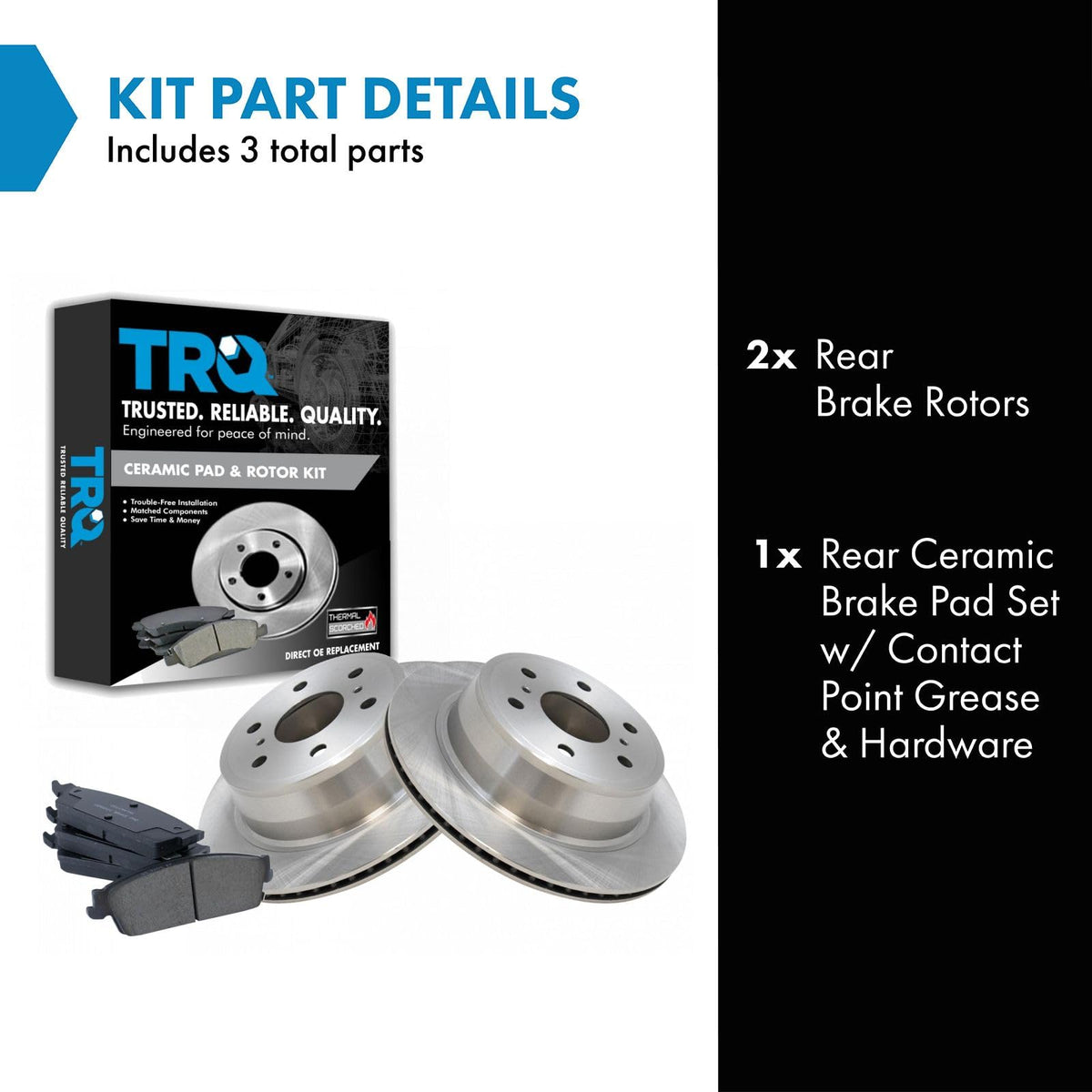 Ceramic Brake Pad & Rotor KitKit Includes(1) Rear Ceramic Brake Pad Set(2) Rear Brake RotorsFitmentCompatible with: 2008-13 Chevrolet Silverado 1500 RearCompatible with: 2007-14 Chevrolet Tahoe RearCompatible with: 2008-13 GMC Sierra 1500 RearCompatible with: 2007-14 Chevrolet Suburban 1500 RearCompatible with: 2007-14 GMC Yukon RearCompatible with: 2007 Chevrolet Silverado 1500 RearCompatible with: 2007-13 Chevrolet Avalanche RearCompatible with: 2007-14 GMC Yukon XL 1500 RearCompatible with: 2007-14 Cadillac Escalade RearCompatible with: 2007 GMC Sierra 1500 RearCompatible with: 2007-14 Cadillac Escalade ESV RearCompatible with: 2007-13 Cadillac Escalade EXT RearProduct AttributesBrake Pad Friction Material: CeramicBrake Pad Bonding Type: Premium PosiProduct Features Positive Molded - Less dust resulting in clean wheels G3000 Casting Alloy - Reduced noise and improved wear resistance Application Specific Design - Extended service life, no modificationsItem DetailsTRQ brake kits are designed to restore your brake system to like-new performance. TRQ brake pads are positive molded, thermal scorched, chamfered, and utilize a multi-layer shim for enhanced performance and service life. TRQ rotors have a non-directional finish that reduces the break-in period for new rotors as well as reducing vibrations throughout the rotors lifecycle. All products are fit and road-tested in our Massachusetts R&D facility to ensure we deliver on our promise of Trusted Reliable Quality.Reference NumbersAimco: 55133Bendix: PRT5729Cadillac: 15792633, 15945636, 25949454Chevrolet: 15792633, 15945636, 19159252, 19329677, 23112025, 25949454DuraGo: BR55133GMC: 15792633, 15945636, 25949454Raybestos Brakes: 580422, 580422FZN, 580422P, 580422PER, 580422R, 581032, 581032FZN, 581032P, 581032PER, 581032R, EHT1194H, MGD1194CHWagner: BD126457, BD180316