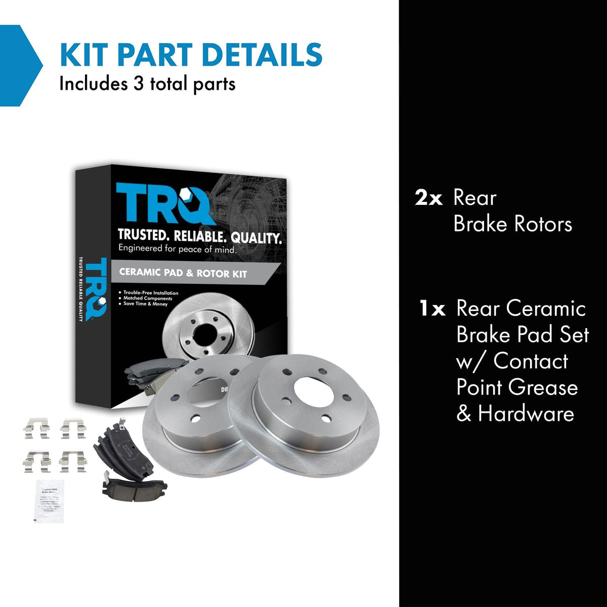 Ceramic Brake Pad & Rotor KitKit Includes(1) Rear Ceramic Brake Pad Set(2) Rear Brake RotorsFitmentCompatible with: 2000-05 Chevrolet Impala RearCompatible with: 1999-05 Pontiac Grand Am RearCompatible with: 2000-05 Chevrolet Monte Carlo RearCompatible with: 1997-03 Pontiac Grand Prix RearCompatible with: 1997-04 Buick Regal RearCompatible with: 1999-04 Olds Alero RearCompatible with: 2002-04 Chevrolet Venture All Wheel Drive RearCompatible with: 2004-05 Buick Century RearCompatible with: 2002-05 Pontiac Montana Front Wheel Drive RearCompatible with: 1998-02 Olds Intrigue RearCompatible with: 1999-01 Pontiac Montana RearCompatible with: 1997-98 Pontiac Trans Sport RearProduct AttributesRear Brake Rotor Diameter: 10.94 in. (278mm)Wheel Lug Count: 5 LugBrake Pad Friction Material: CeramicBrake Pad Bonding Type: Premium PosiRear Brake Rotor Venting Type: SolidProduct Features Positive Molded - Less dust resulting in clean wheels G3000 Casting Alloy - Reduced noise and improved wear resistance Application Specific Design - Extended service life, no modificationsItem DetailsTRQ brake kits are designed to restore your brake system to like-new performance. TRQ brake pads are positive molded, thermal scorched, chamfered, and utilize a multi-layer shim for enhanced performance and service life. TRQ rotors have a non-directional finish that reduces the break-in period for new rotors as well as reducing vibrations throughout the rotors lifecycle. All products are fit and road-tested in our Massachusetts R&D facility to ensure we deliver on our promise of Trusted Reliable Quality.Reference NumbersAimco: 55039Bendix: PRT5155Buick: 18023377, 18029844Chevrolet: 18023377DuraGo: BR55039Hollander: 533-02339Oldsmobile: 18023377, 18029844Pontiac: 18023377, 18029844Raybestos Brakes: 56629, 56629FZN, 56629P, 56629R, EHT698H, MGD698CH, SGD698CWagner: BD125506