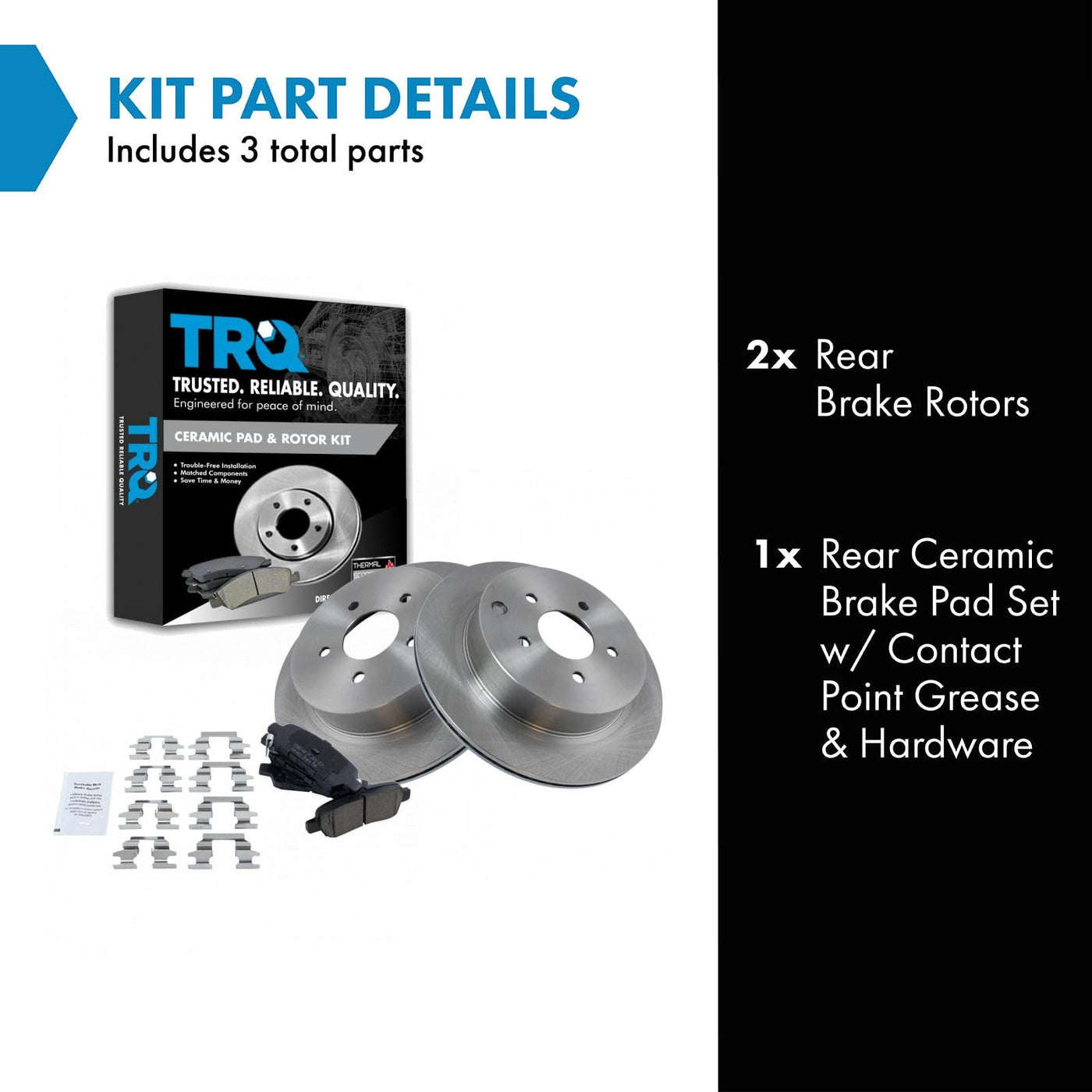 Ceramic Brake Pad & Rotor KitKit Includes(1) Rear Ceramic Brake Pad Set(2) Rear Brake RotorsFitmentCompatible with: 2009-22 Nissan Murano RearCompatible with: 2013-20 Nissan Pathfinder RearCompatible with: 2014-20 Infiniti QX60 RearCompatible with: 2003-07 Nissan Murano RearCompatible with: 2014-17 Infiniti Q50 Premium RearCompatible with: 2014-17 Infiniti Q50 Base Model RearCompatible with: 2014-17 Infiniti Q50 Hybrid Premium RearCompatible with: 2004-09 Nissan Quest RearCompatible with: 2011-17 Nissan Quest RearCompatible with: 2003-08 Infiniti FX35 RearCompatible with: 2018 Infiniti Q50 Luxe without Performance Package without Sport Package RearCompatible with: 2018 Infiniti Q50 Sport without Performance Package without Sport Package RearCompatible with: 2018 Infiniti Q50 Hybrid Luxe without Performance Package without Sport Package RearCompatible with: 2018 Infiniti Q50 Pure without Performance Package without Sport Package RearCompatible with: 2013 Infiniti JX35 RearCompatible with: 2011-13 Infiniti M37 without Sport Package RearCompatible with: 2010-12 Infiniti FX35 with Manual Parking Brake with Vented Rear Rotors RearCompatible with: 2015-17 Infiniti QX70 RearCompatible with: 2017 Infiniti Q60 Premium without Sport Package RearCompatible with: 2017 Infiniti Q60 Base Model without Sport Package RearCompatible with: 2015-19 Infiniti Q70L with 12.12 in. 308mm Diameter Rear Rotors without Sport Package RearCompatible with: 2014-17 Infiniti Q70 without Sport Package RearCompatible with: 2018 Infiniti Q60 Luxe without Sport Package RearCompatible with: 2018 Infiniti Q60 Pure without Sport Package RearCompatible with: 2003-08 Infiniti FX45 RearCompatible with: 2013 Infiniti FX37 RearCompatible with: 2014 Infiniti QX70 V6 3.7L RearCompatible with: 2018 Infiniti Q70 5.6 Luxe without Sport Package RearCompatible with: 2018 Infiniti Q70 3.7 Luxe without Sport Package RearCompatible with: 2018 Infiniti Q70 Hybrid RearCompatible with: 2019 Infiniti Q70 without Sport Package RearCompatible with: 2011 Infiniti M56 without Sport Package RearCompatible with: 2012-13 Infiniti M35h RearCompatible with: 2012 Infiniti M56 X without Sport Package RearCompatible with: 2013 Infiniti M56 without Sport Package RearProduct AttributesRear Brake Rotor Diameter: 12.13 in. (308mm)Wheel Lug Count: 5 LugBrake Pad Friction Material: CeramicBrake Pad Bonding Type: Premium PosiRear Brake Rotor Venting Type: SolidProduct Features Positive Molded - Less dust resulting in clean wheels G3000 Casting Alloy - Reduced noise and improved wear resistance Application Specific Design - Extended service life, no modificationsItem DetailsTRQ brake kits are designed to restore your brake system to like-new performance. TRQ brake pads are positive molded, thermal scorched, chamfered, and utilize a multi-layer shim for enhanced performance and service life. TRQ rotors have a non-directional finish that reduces the break-in period for new rotors as well as reducing vibrations throughout the rotors lifecycle. All products are fit and road-tested in our Massachusetts R&D facility to ensure we deliver on our promise of Trusted Reliable Quality.Reference NumbersAimco: 31348Bendix: PRT5537DuraGo: BR31348Hollander: 533-58677INFINITI: 44060AL585, 44060AM485, 44060EG00J, 44060EG00K, 44060EG085Nissan: 440608H385, 44060AL585, 44060AL586, 44060AM485, 44060CB10J, 44060EG00J, D40608H385Raybestos Brakes: 980155, 980155FZN, 980155P, 980155PER, 980155R, EHT1288H, EHT905H, MGD905CHWagner Brake: ZD1393Wagner: BD126095