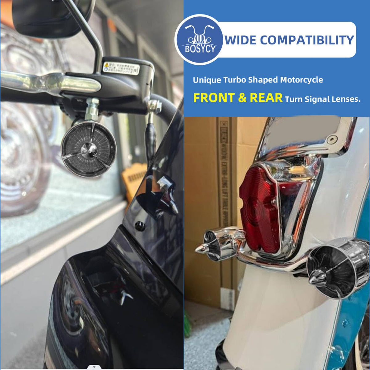 Q: What is the unique design feature of the BOSYCY motorcycle turn signal lens covers?A: The BOSYCY motorcycle turn signal lens covers feature a uniquely crafted turbine-shaped design that disperses light into distinct sections, creating a mesmerizing central effect. This illuminating design not only enhances visibility but also adds a stylish touch to your motorcycle.