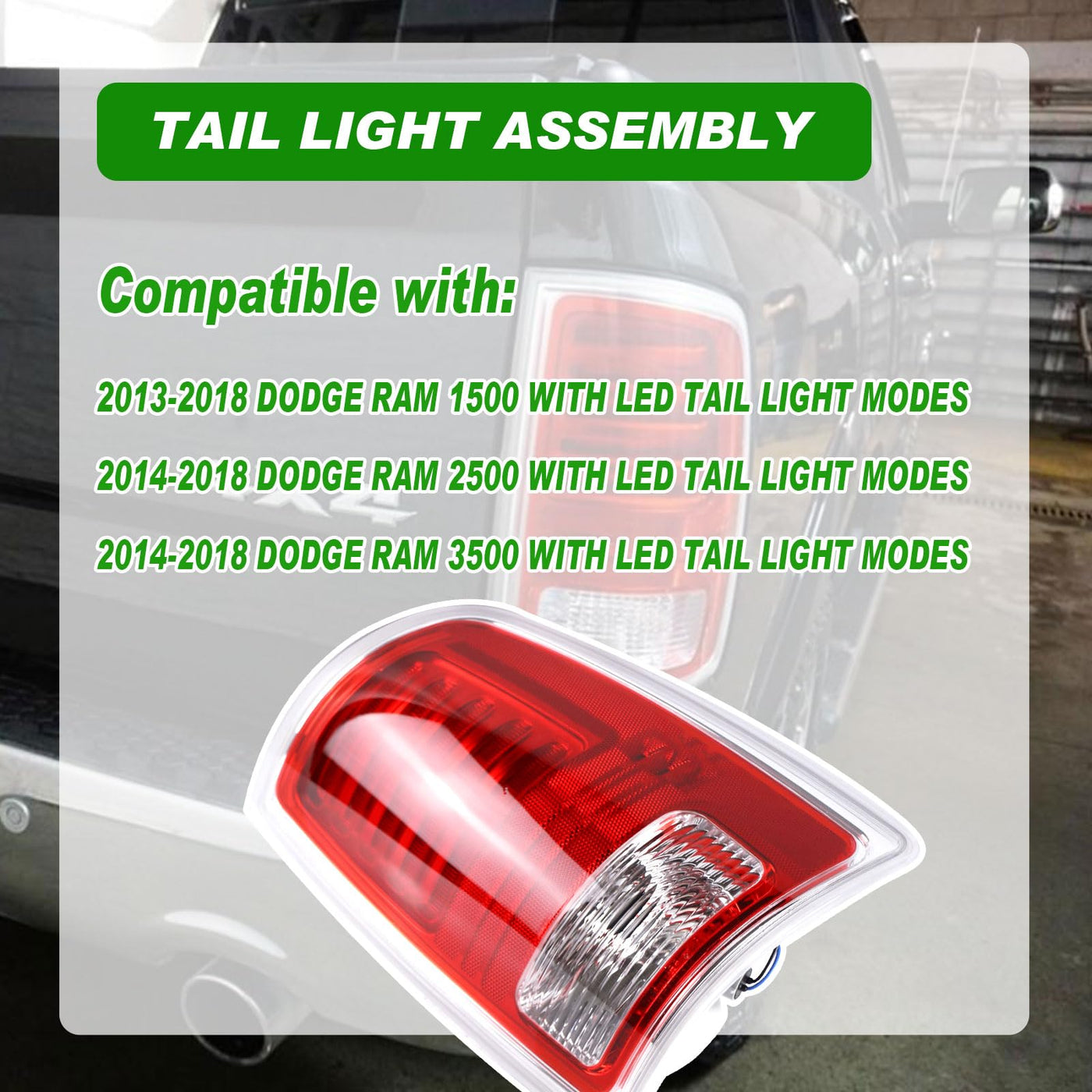 Tail Light Assembly Compatible With Dodge Ram 1500 2013-2018 Ram 2500&3500 2014-2018 Right Passenger Side Led Taillights Rear Outer Tail Lamp Replace Ch2801203 68093078Ab 68093078Ac New Upgraded Led Rear Taillights With Bulb Assembly Compatible With Dodge Ram 1500 2013 2014 2015 2016 2017 2018, Ram 2500 & 3500 2014 2015 2016 2017 2018. Right Passenger Side Tail Light Replacement Part Number: Ch2801203, 68093078Ab, 68093078Ac. Direct Replacement. Ram Tail Lights Assembly Made Of High Quality Abs Plastic Material, Waterproof And Dustproof. Long Service Life And High Brightness. The Led Tail Light Easy To Install. Plug And Play. The Rear Tail Light Lamp From Lochnchn. If You Have Any Questions Please Contact Us We Will Solve Them For You The First Time. Please Check The Car Model And Year Carefully Before Ordering.