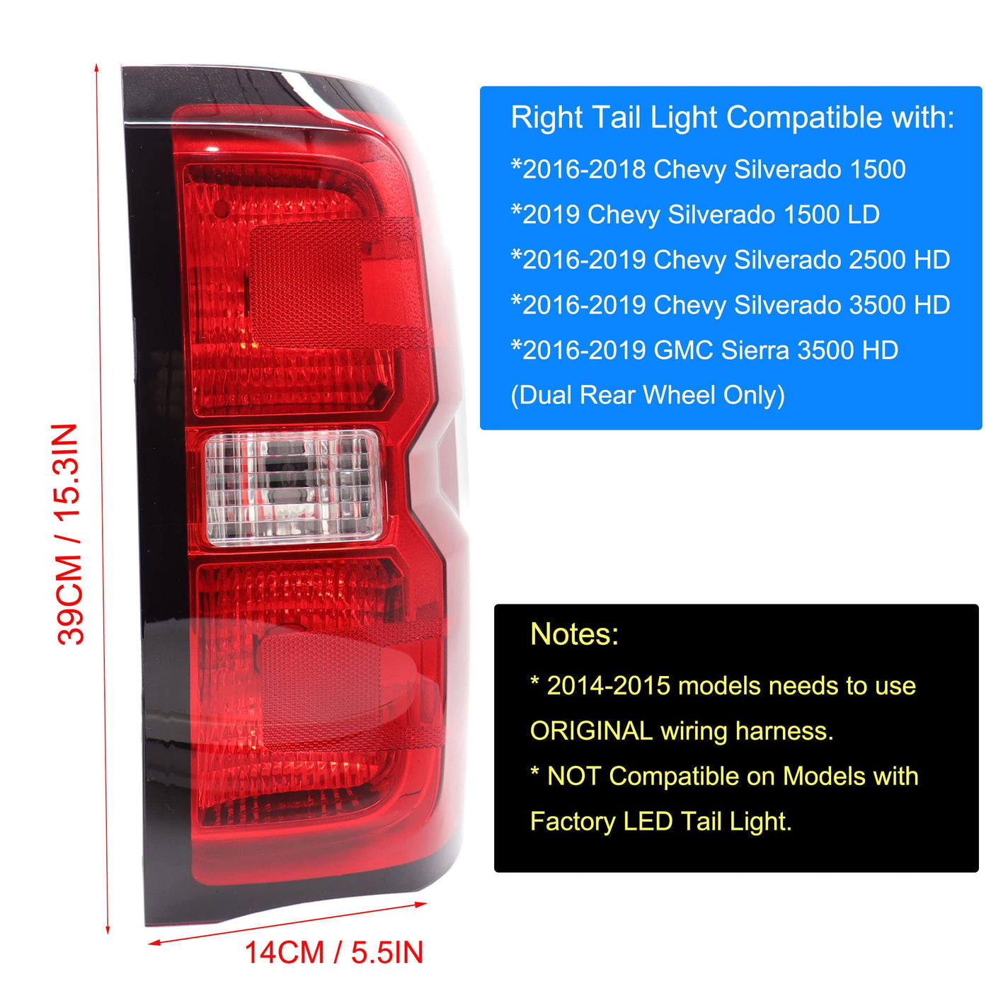 Q: Is the MOCW Right Tail Light compatible with my 2014 Chevy Silverado?A: Yes, the MOCW Right Tail Light is compatible with the 2014 Chevy Silverado 1500, 2500 HD, and 3500 HD models. Please ensure to reuse the original wiring harness for proper installation.