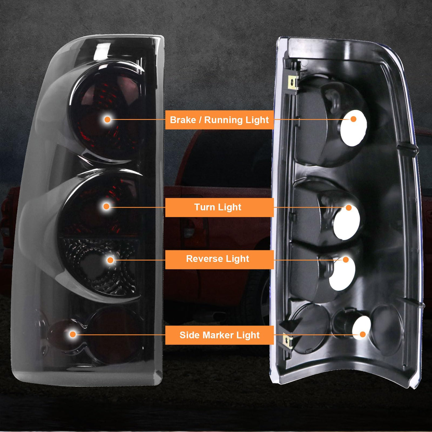 Tail Light Assembly Compatible With Chevrolet 1999-2006 Chevy Silverado 1500/ 1500 Hd 1999-2006 Chevy Silverado 2500/ 2500 Hd 2001-2006 Chevy Silverado 3500/ 3500 Hd 2007 Chevy Silverado With Classic Body Style Note: Not Fit Other Models Gmc 1999-2002 Gmc Sierra 1500 1999-2002 Gmc Sierra 2500 2001-2002 Gmc Sierra 3500 Note: Do Not Fit Classic Body Style,Barn Door Or Stepside Models Specifications: Voltage: 12V Material: Pmma Waterproof:Ip67 Housing Color: Black Matte/ Smoke Lens Placement On Vehicle: Rear, Left, Right Bulbs: Not Included (Please Reuse The Original Bulbs) Replace Oem Number: 99-02:L: 19169017&Nbsp;&Nbsp; &Nbsp; &Nbsp; &Nbsp;R: 19169018 03-06:L: 19169004&Nbsp;&Nbsp; &Nbsp; &Nbsp; &Nbsp;R: 19169005 Partslink Number: 99-02:L:Gm2800186 &Nbsp; &Nbsp; &Nbsp;R:Gm2801173, Gm2801186 03-06:L:Gm2800174 &Nbsp; &Nbsp; &Nbsp;R:Gm2801174 Features: -Direct Replacement, Drilling Or Cutting Are Not Required -Superior Uv Protection And A High Impact Resistance -Brings A Different And Attractive Appearance To Vehicle -Superior Material With Toughness And Heat Resistance Functions Packaging Include: 2* Tail Light Assemblies (Left+Right) Bulbs Are Not Included