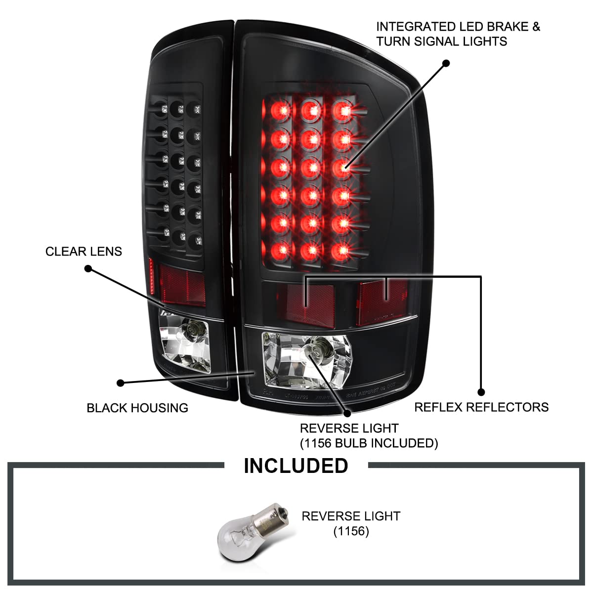 Q: What vehicles are compatible with the Spec-D Tuning Black Housing LED Tail Lights?A: These tail lights are specifically designed to be compatible with 2002-2006 Dodge Ram 1500, 2500, and 3500 models, ensuring a perfect fit for your truck.