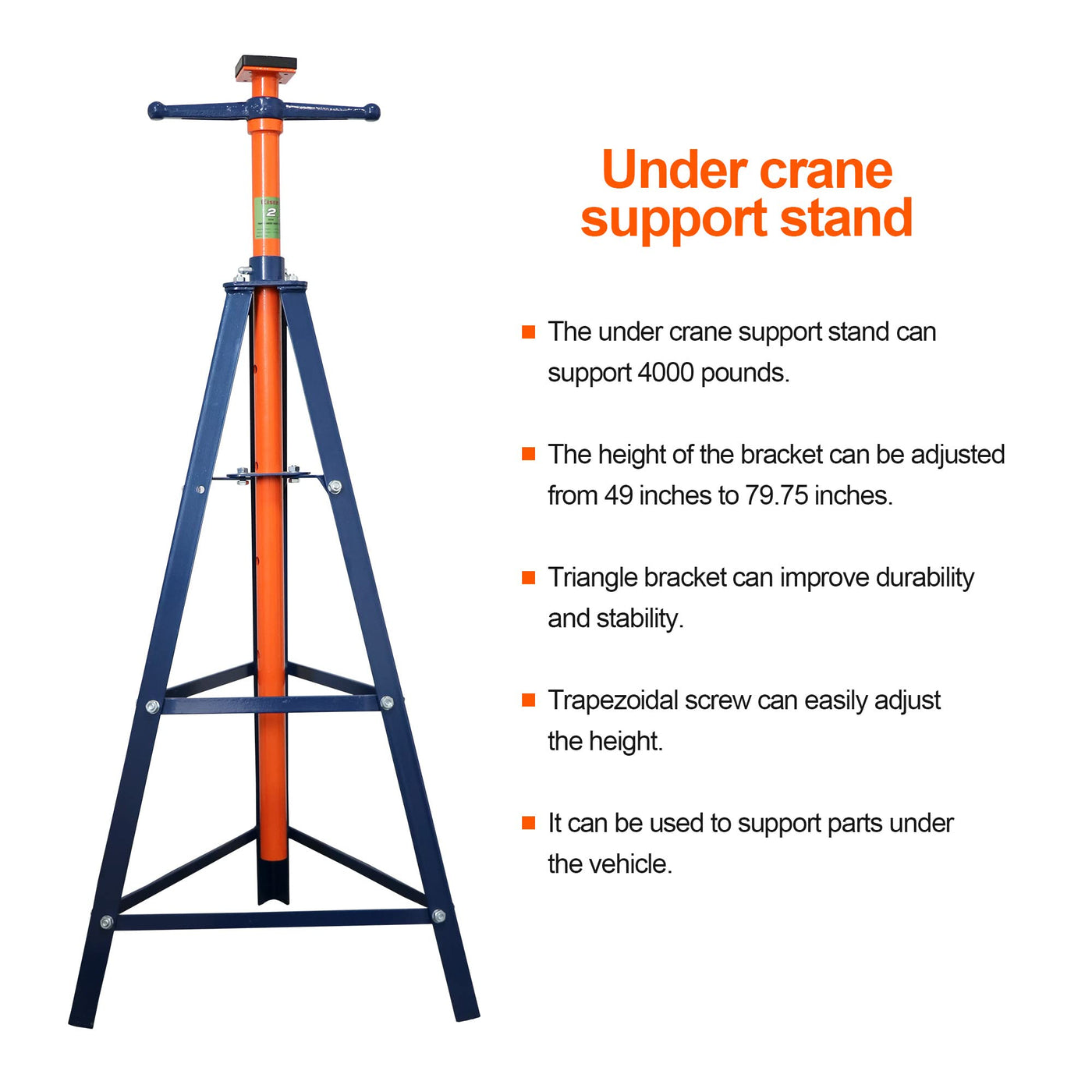 Durable Structure: The Lower Hanger Of The Crane Frame Is Made Of High-Quality Carbon Steel, The Blue-Painted Finish Is Corrosion-Resistant And Durable.Maximum Height / Weight Capacity: 79.750 ''/ 4400Lb]: The Minimum Lifting Height Is 49 In., The Maximum Lifting Height Is 79.75 In., And The Maximum Lifting Capacity Can Reach 4400Lb.Stability: A Tripod Base With A Square Saddle Is Used To Achieve Stability. Measurements: 24.4'' Triangle Base, 3.08'' Square Saddle.Portability: The Bracket Under The Lifting Table Is Foldable, Light, And Easy To Carry. 5 ''Fine-Tuning'' Acme Screw Meets The Safety Standard Of Asme Pase / 2014.