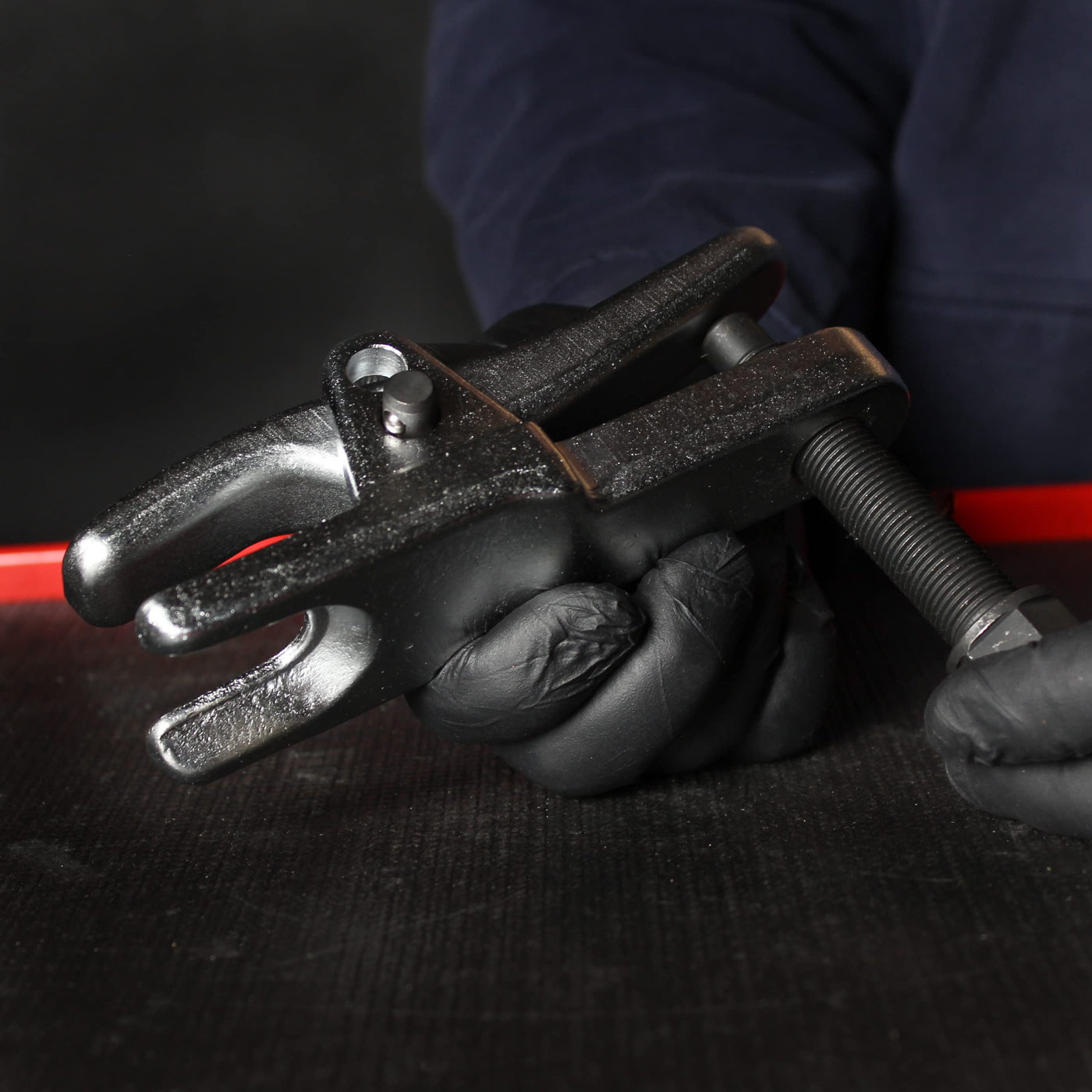 Q: How do I use the ABN Ball Joint Separator effectively?A: To use the ABN Ball Joint Separator, slip the forked end between the boot and the metal attachment point, ensuring the pivot finger is squarely on the threaded end. Tighten the bolt until you feel resistance, then tap the attachment point and the finger with a hammer while tightening further until the ball joint loosens.