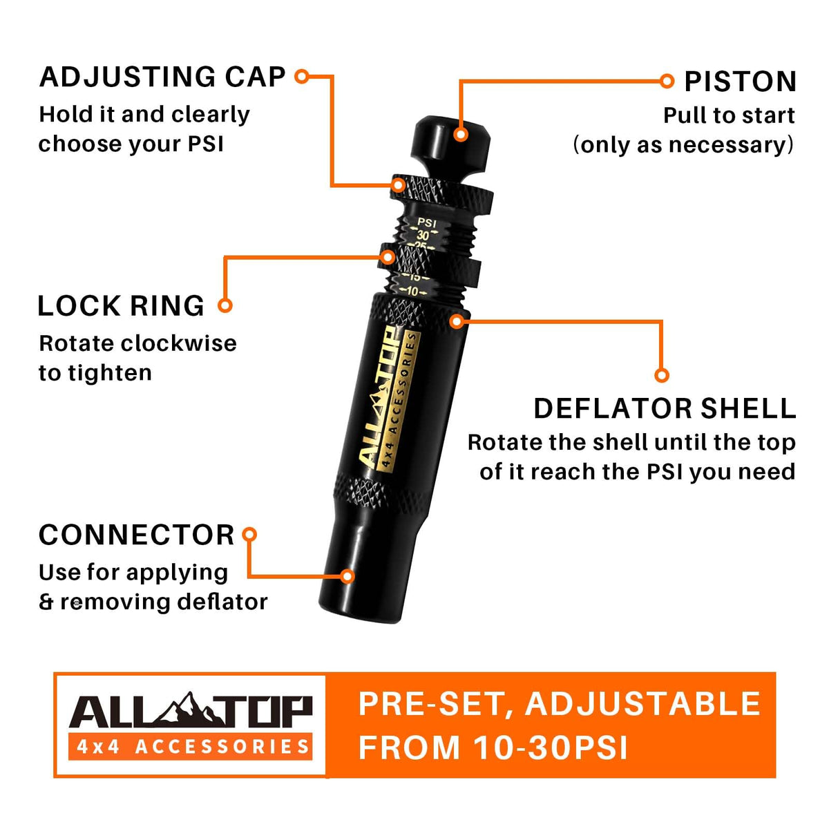 Q: How does the ALL-TOP Adjustable Auto-Stop Tire Deflator work?A: The ALL-TOP Adjustable Auto-Stop Tire Deflator uses a pre-set PSI value to automatically stop the air release when the desired pressure is reached. Simply twist the Deflator Shell to adjust the pressure from 10 PSI to 30 PSI, and it will stop deflating once the set pressure is achieved.