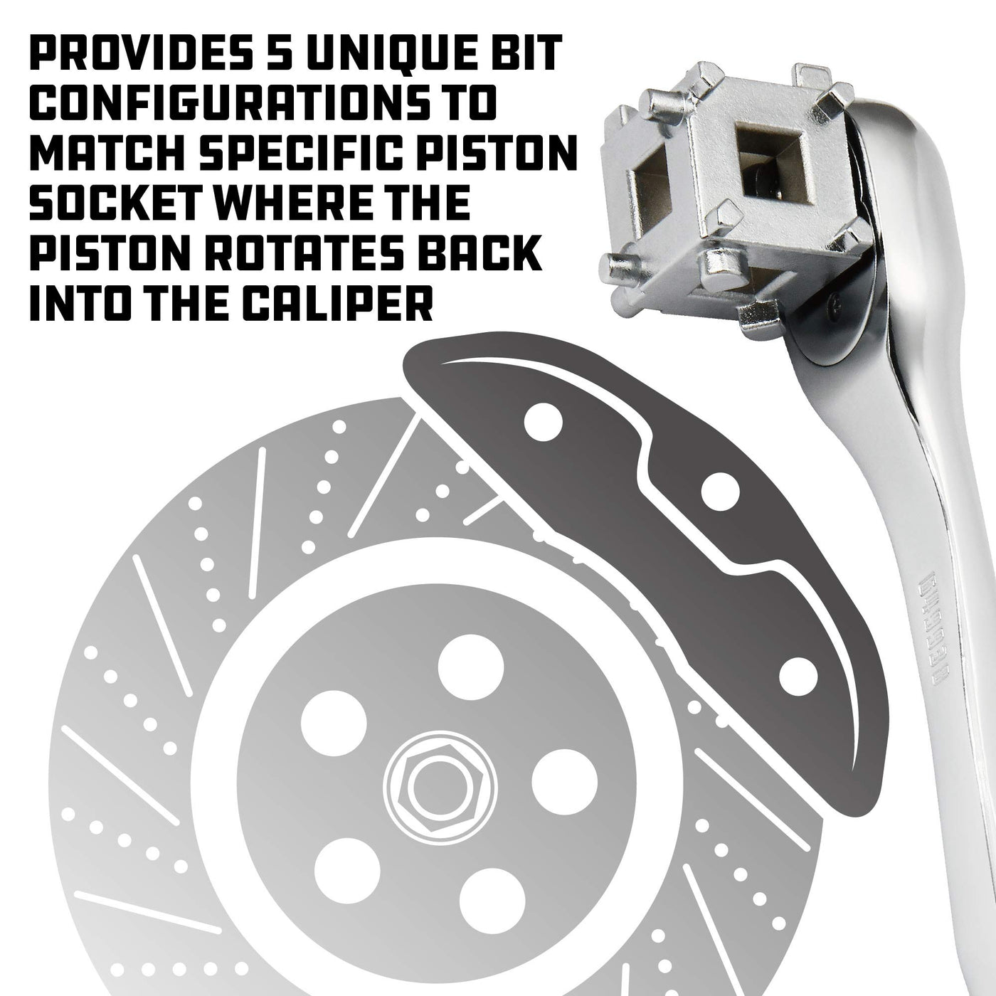 Q: How do I use the Powerbuilt Disc Brake Piston Tool?A: To use the tool, attach it to a 3/8" drive ratchet or drive tool, then insert the appropriate bit configuration into the caliper piston. Rotate the tool to depress the piston back into the cylinder bore for easy installation of new brake pads.