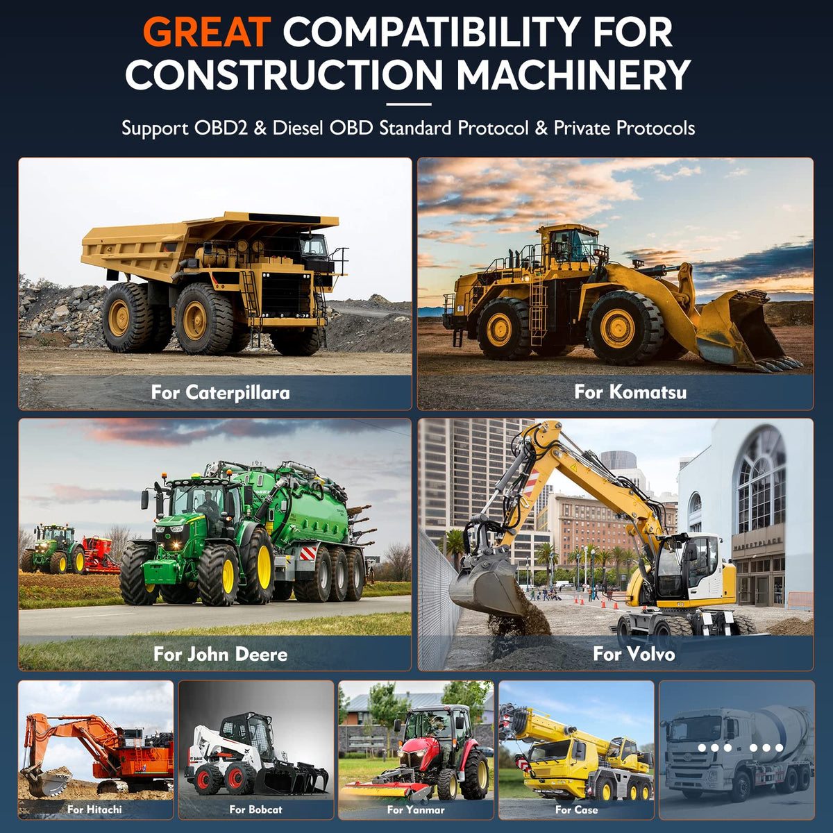 Q: What types of vehicles is the ANCEL HD3600 compatible with?A: The ANCEL HD3600 is designed for a wide range of heavy-duty construction machinery, including brands like Caterpillar, Komatsu, John Deere, Volvo, Hitachi, Bobcat, Yanmar, and Case. It handles both standard and manufacturer-specific diesel OBD protocols, making it suitable for 99% of construction vehicles in the North American market.