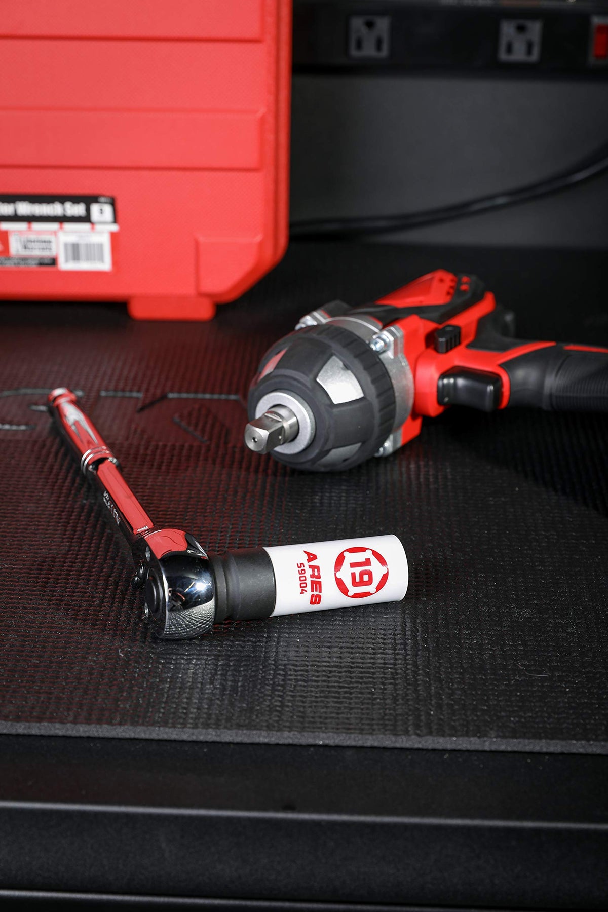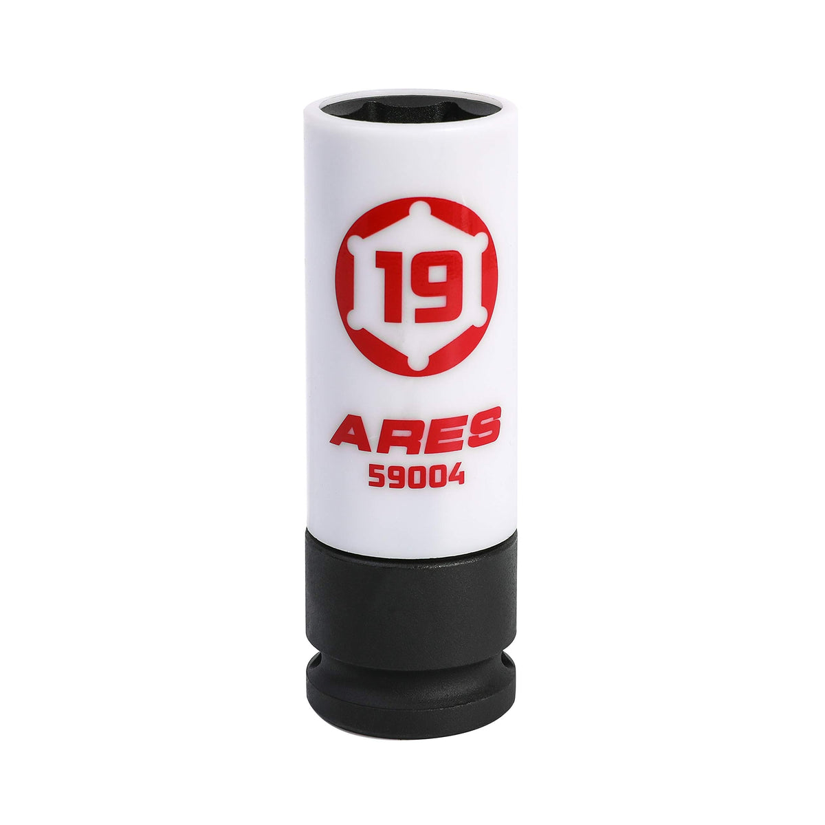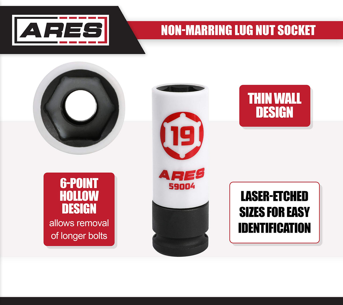 Protect Your Rims The ARES 19 mm Non-Marring Lug Nut Socket will remove bolts while preventing damage to your aluminum or custom rims, thanks to its protective vinyl jacket. The hollow design allows room for removing longer bolts, and the non-marring insert will protect your lugs. Made with chrome molybdenum, it's strong enough to use with an impact wrench without worrying about damaging your new car or aftermarket rims. Protecting your big investment with the right tool makes sense. Features: Includes: 1 pc. 19 mm non-marring lug nut socket 1/2 in. drive Overall length is 85mm, or roughly 3 3/8 in. Outer diameter is 1.15 in. Protective vinyl jacket prevents damage to aluminum or custom rims Hollow design allows removal of longer bolts Non-marring insert protects lugs Constructed of chrome molybdenum Please Note: Some wheels have very confined lug wells and the outer nylon sleeve may be prohibitive in accessing the lug