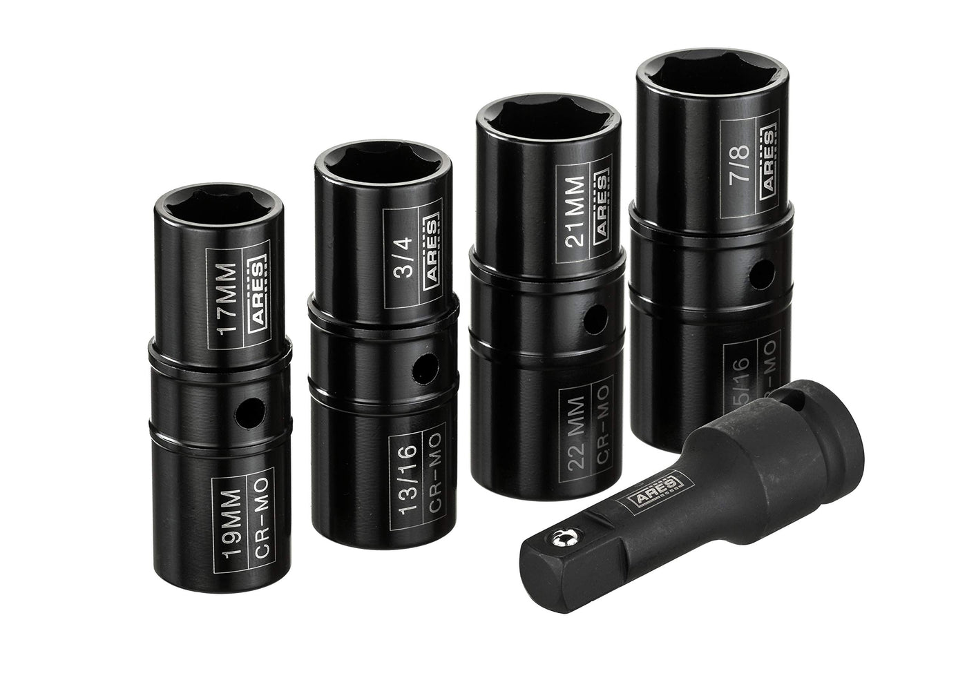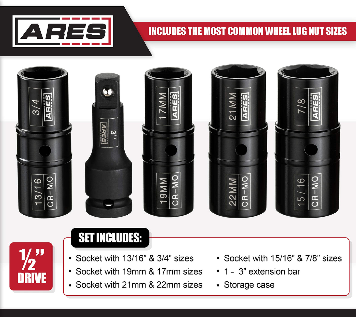 A Must For Tire RemovalThe ARES 5-Piece Flip Lug Nut Socket Set is a must-have for tire changes, brake jobs, or anything requiring tire removal. The four flip sockets include the six most common wheel lug nut socket sizes and two additional sizes for even more use, along with a 3-inch extension bar and convenient storage case. Made of high strength Chrome Molybdenum steel, the electro-phosphate finish combined with laser etched size labeling provides a sleek look and high visibility. These versatile sockets can be safely used with an impact wrench, air ratchet, breaker bar, or torque wrench. Features: Includes: 4 pc. Flip lug nut sockets, 1 pc. 3-inch extension bar, and storage case 1/2-inch drive Socket sizes: 17mm / 19mm, 21mm / 22mm, 3/4-inch / 13/16-inch, and 7/8-inch / 15/16-inch Most common wheel lug nut socket sizes included Constructed of high strength chrome molybdenum steel Electro-phosphate finish Laser-etched size labeling for high visibilitySafe for use with impact wrench, air ratchet, breaker bar, or torque wrench